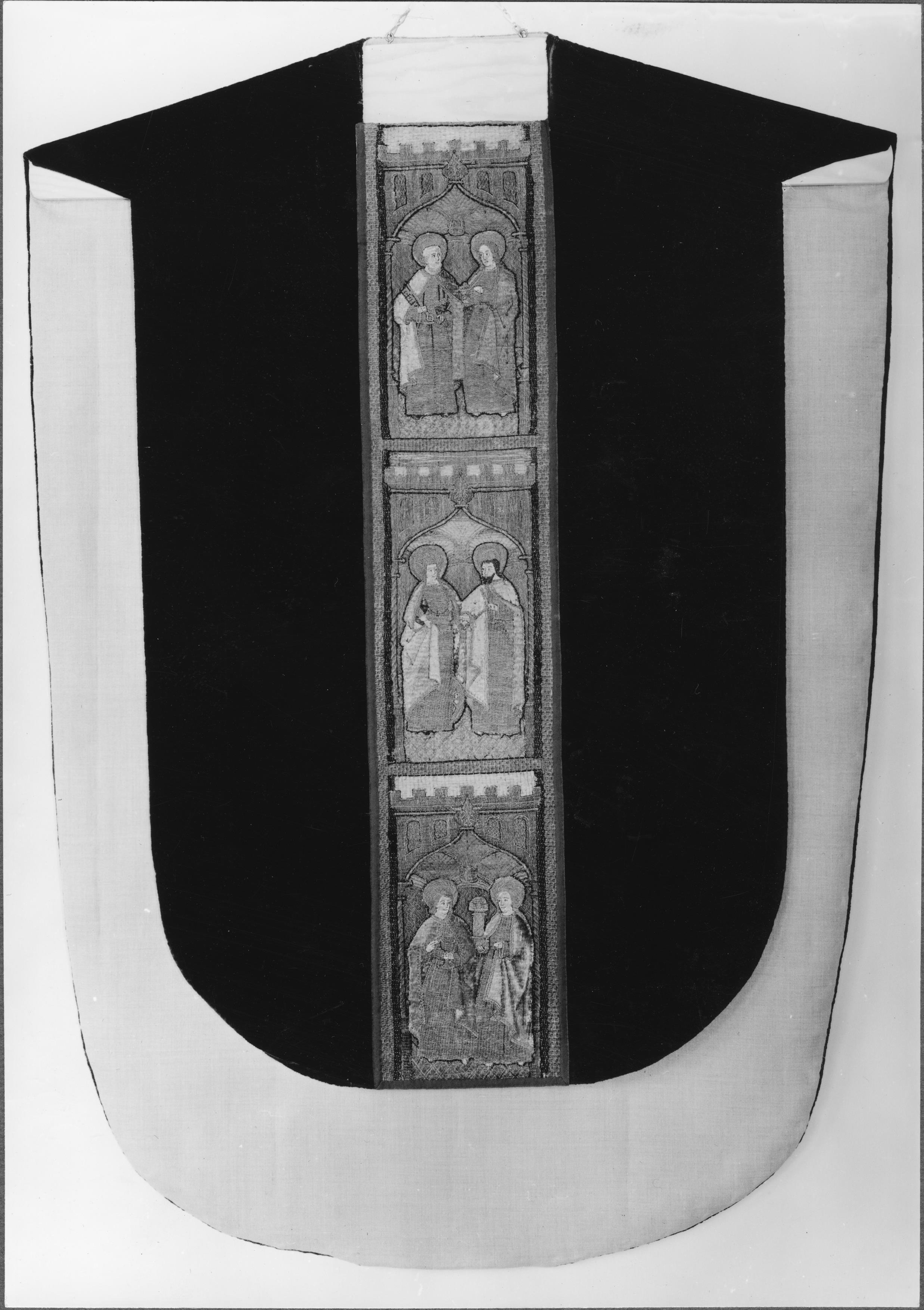 Beskrivning: Mässhake, med broderier. Framsida. Efter konservering.