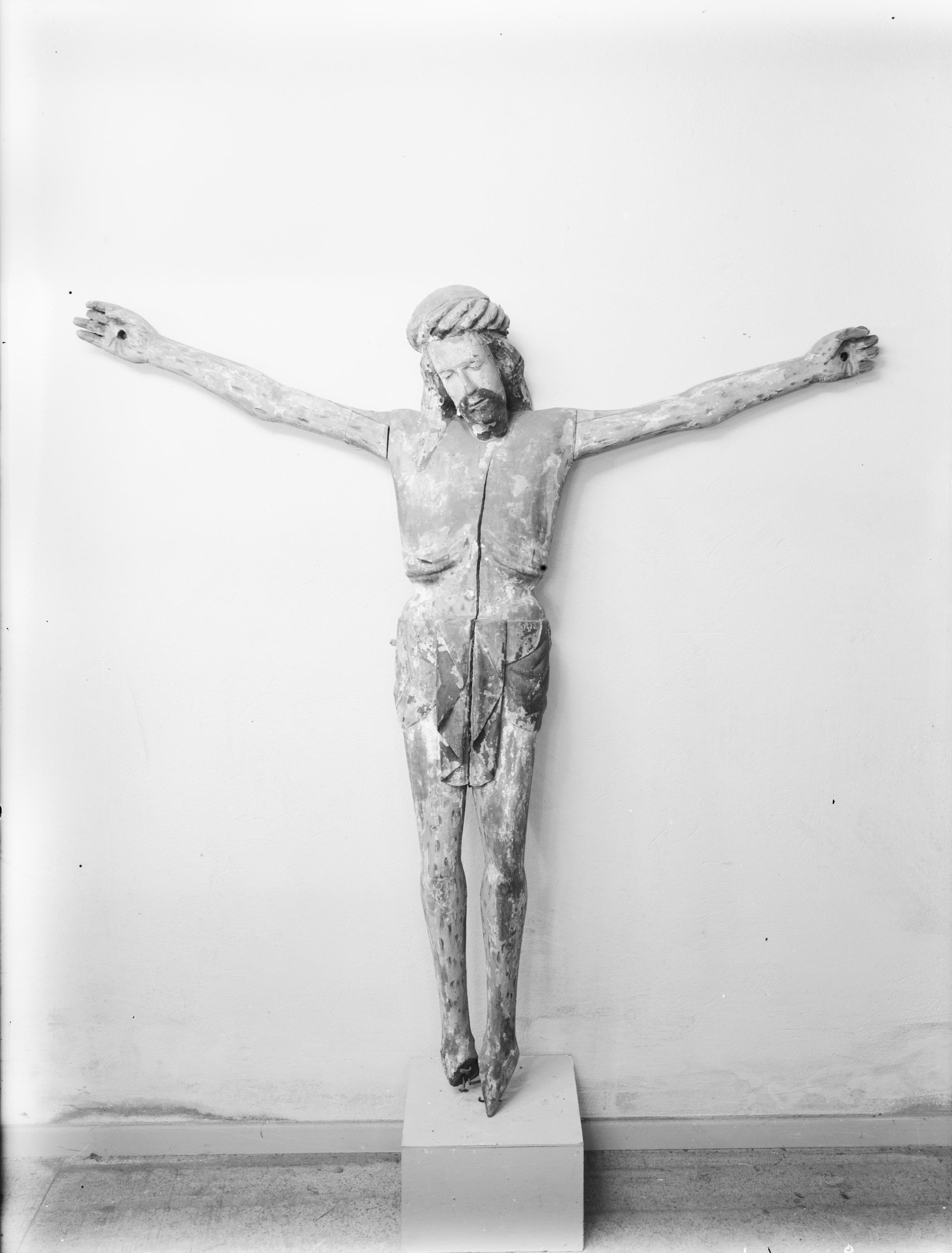 Beskrivning: Kristusbild till krucifix, lövträ. Medeltida.