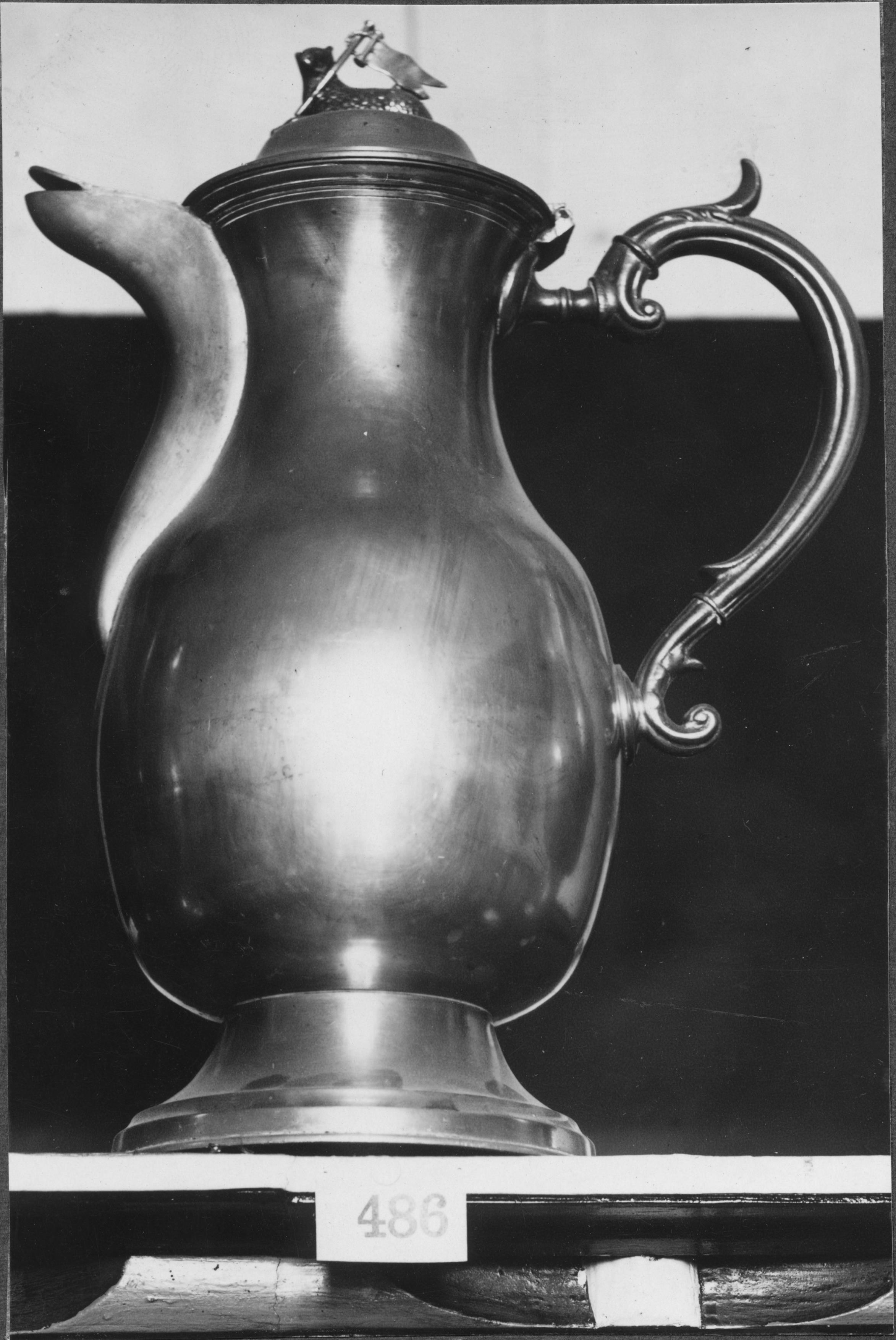 Beskrivning: Vinkanna av tenn, från 1700-talet. Oval buk.