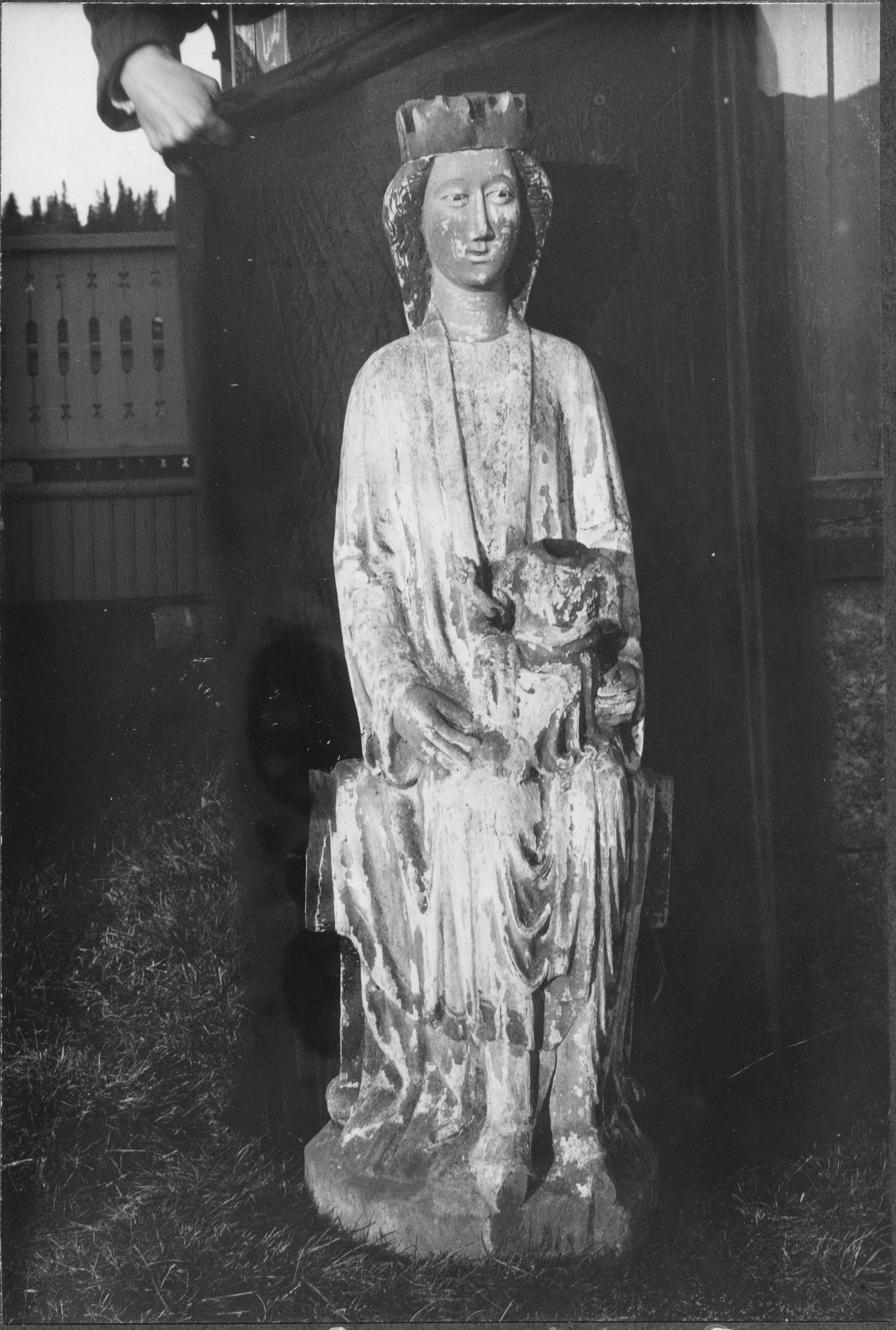 Beskrivning: Madonna med barnet. Skulptur i ek. Barnets huvud och kronans taggar saknas. Färgen skadad: rött, blått, gult, grönt. H. 104 cm. Omkr. 1300. Härnösandsutst. 1912 nr. 20.