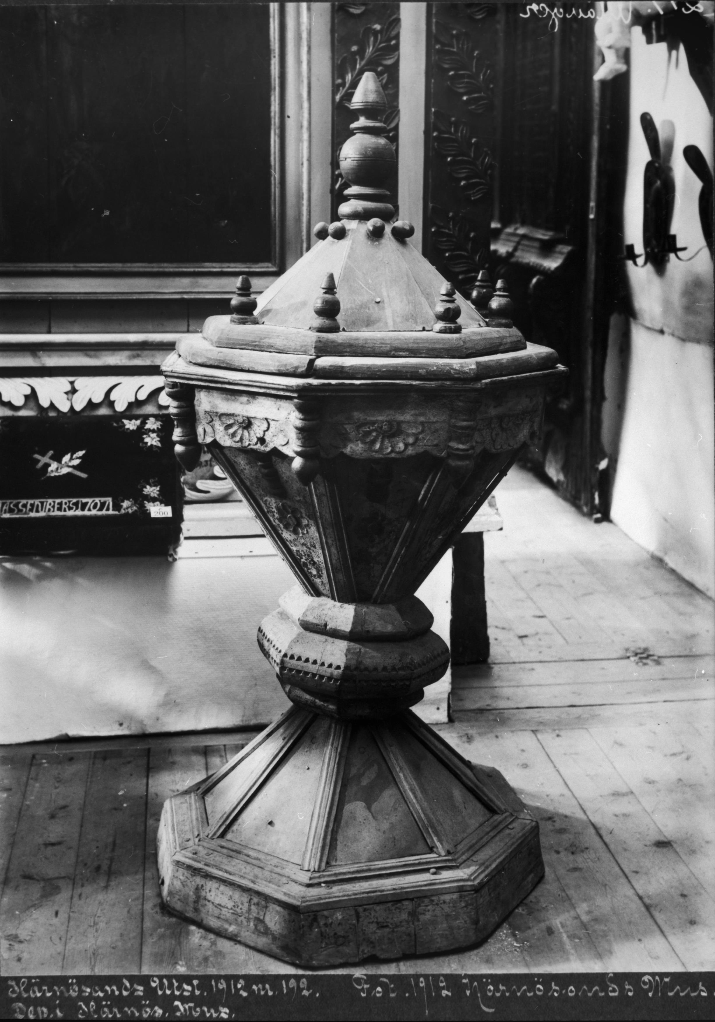 Beskrivning: Dopfunt av trä, åttakantig med lock. 1650-tal.