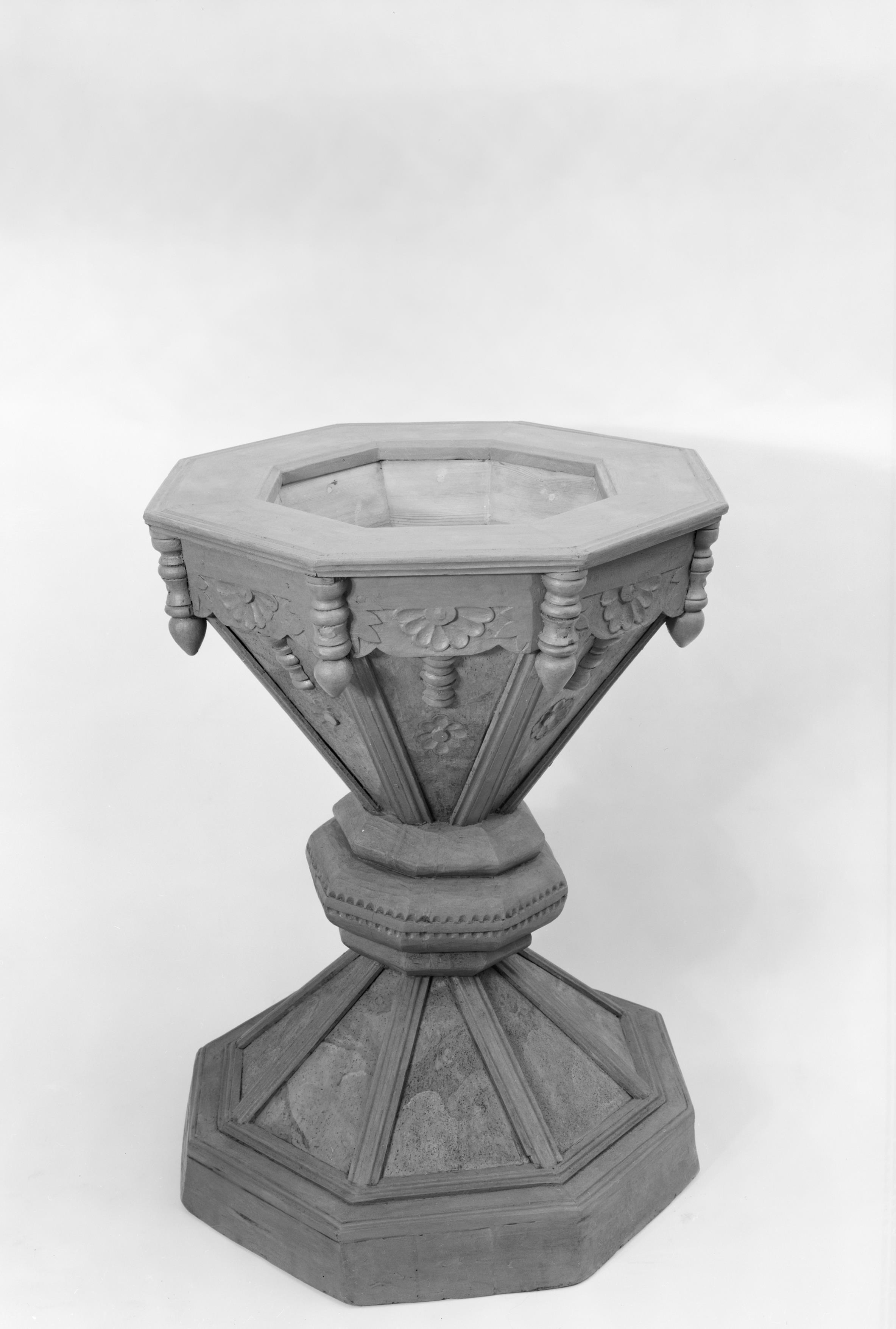 Beskrivning: Beskrivning: Dopfunt av trä, åttakantig med lock. 1650-tal.
