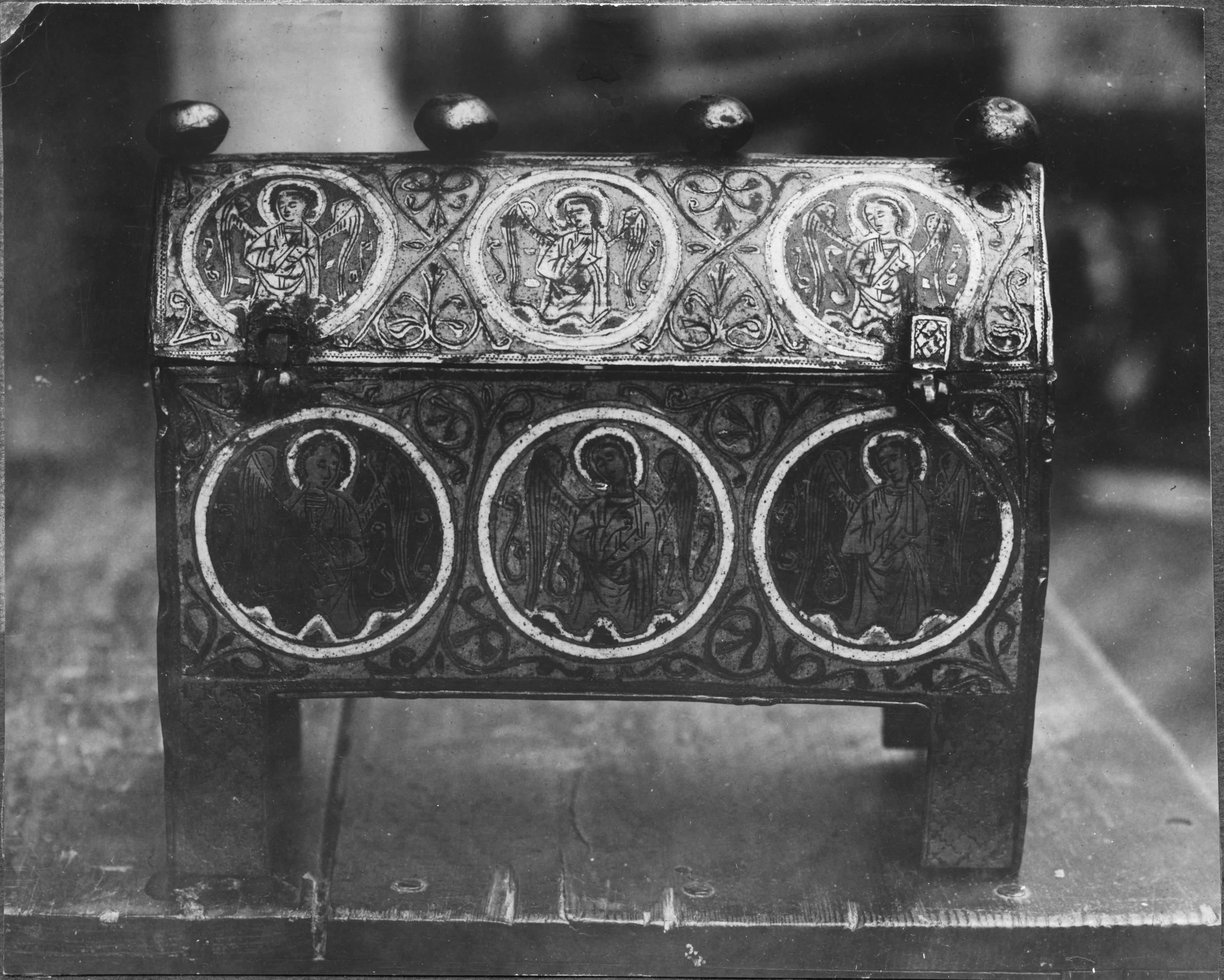 Beskrivning: Relikskrin av koppar, omkring 1200. Franskt arbete.