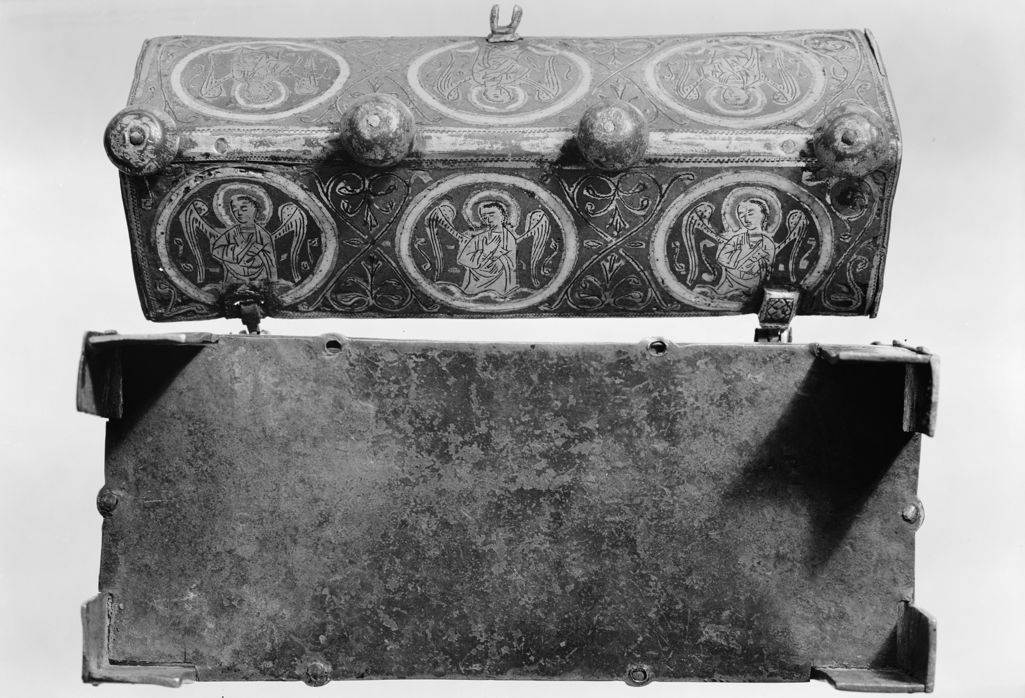 Beskrivning: Relikskrin av koppar, omkring 1200. Franskt arbete.
