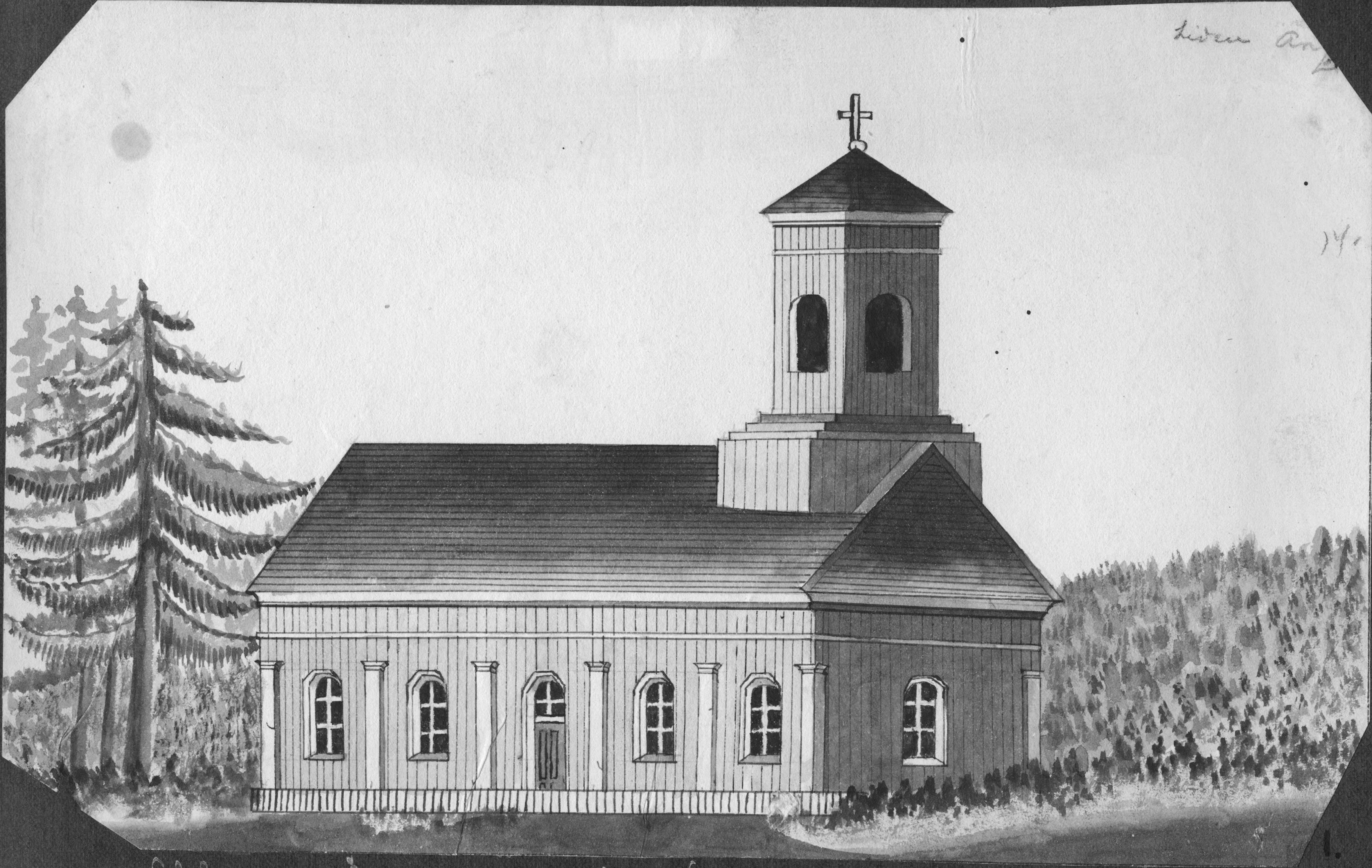 Beskrivning: Teckning av kyrkan. Ur Ohlssons Ångermanlands kyrkor. 1828. Ekdahls samling.