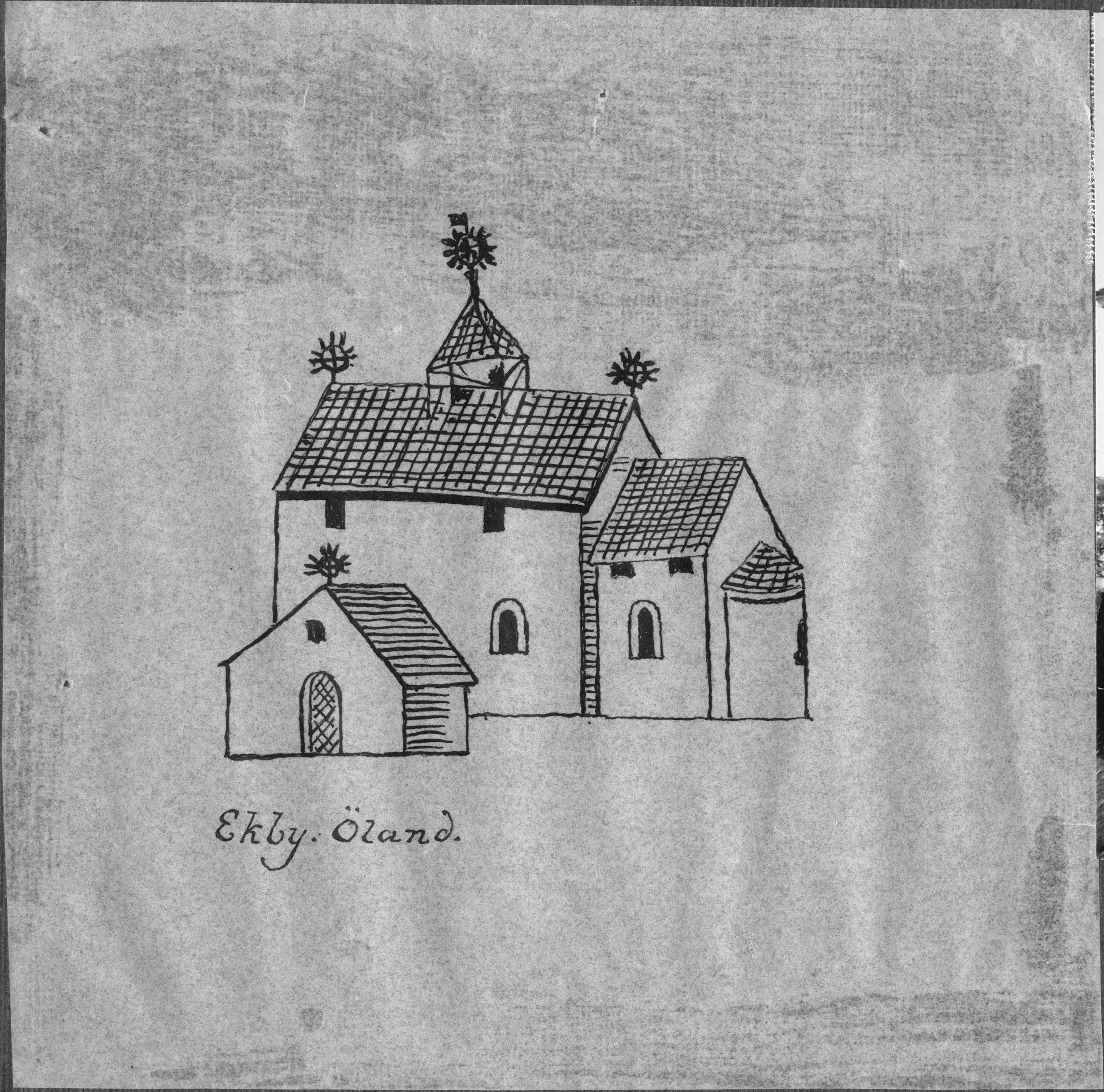 Beskrivning: Teckning av kyrkan från söder, kopierat från Rhezelius.