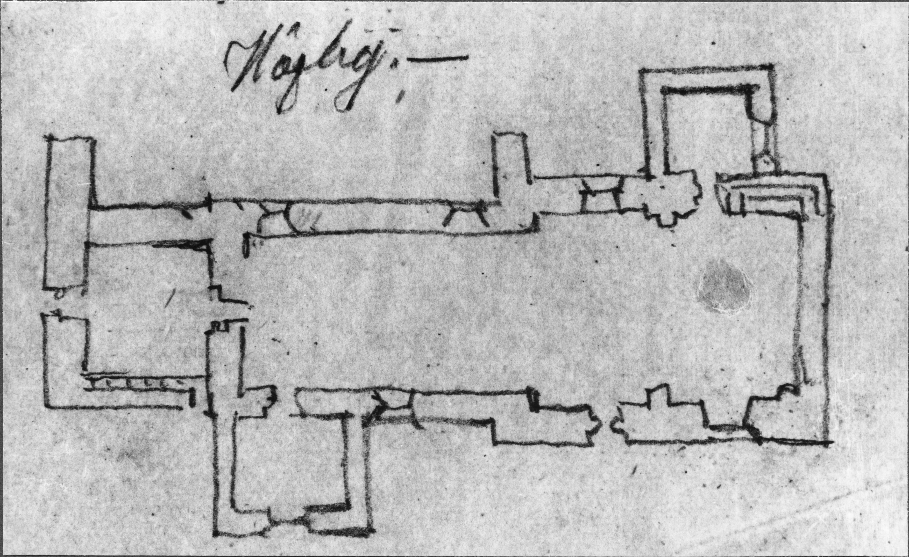 Beskrivning: Planritning av kyrkan från söder. Efter Mandelgrenska samlingen i Lund, där negativet finns.