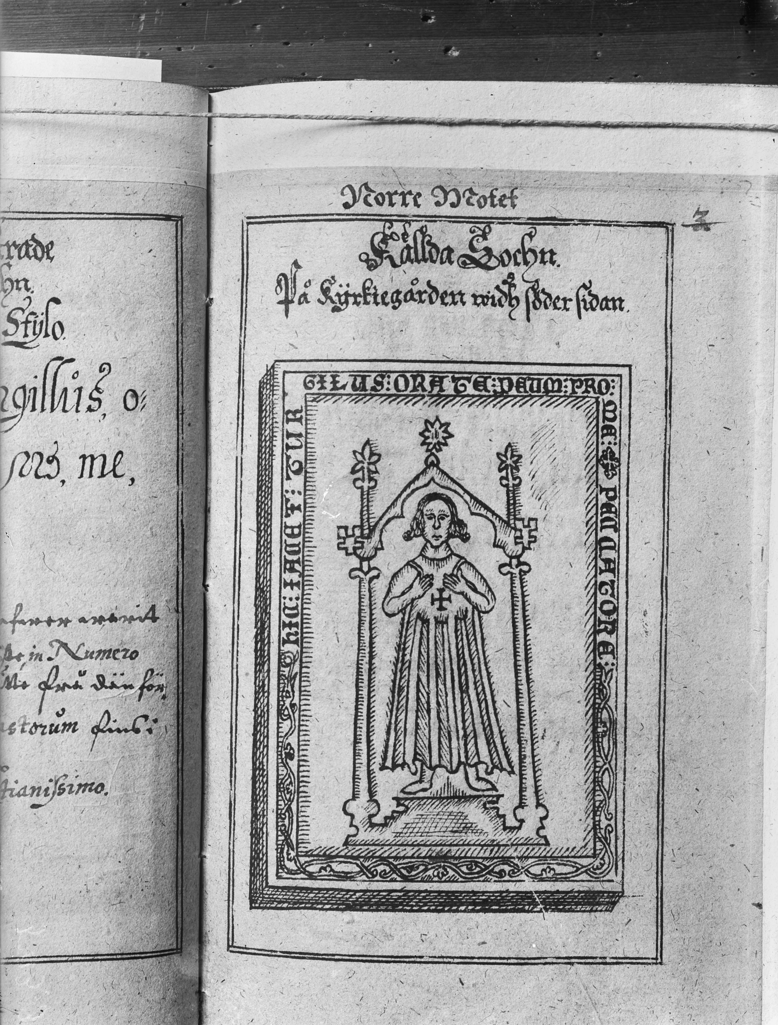Beskrivning: Teckning föreställande gravhäll från 1300-talets början över Tyrgils, förmodligen kyrkoherde i Källa. Ur Rhezelius Mon. rum. in Öl. 1634. KB.
