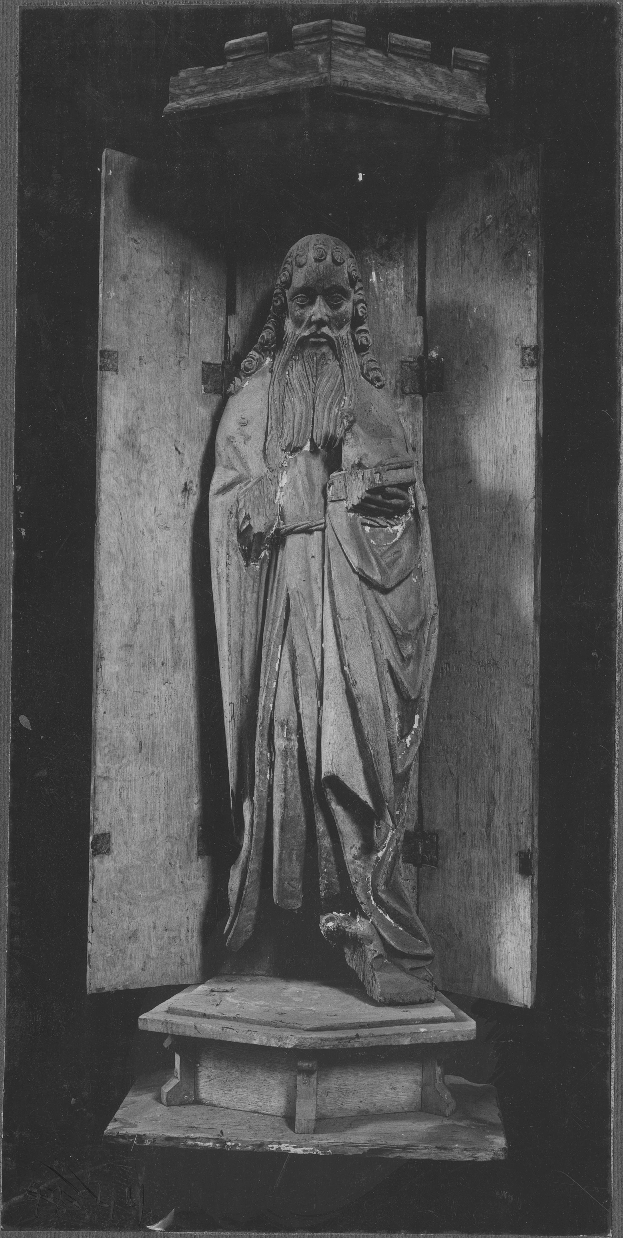Beskrivning: Träskulptur av ek föreställande Johannes döparen. 1400-talets tredje fjärdedel.