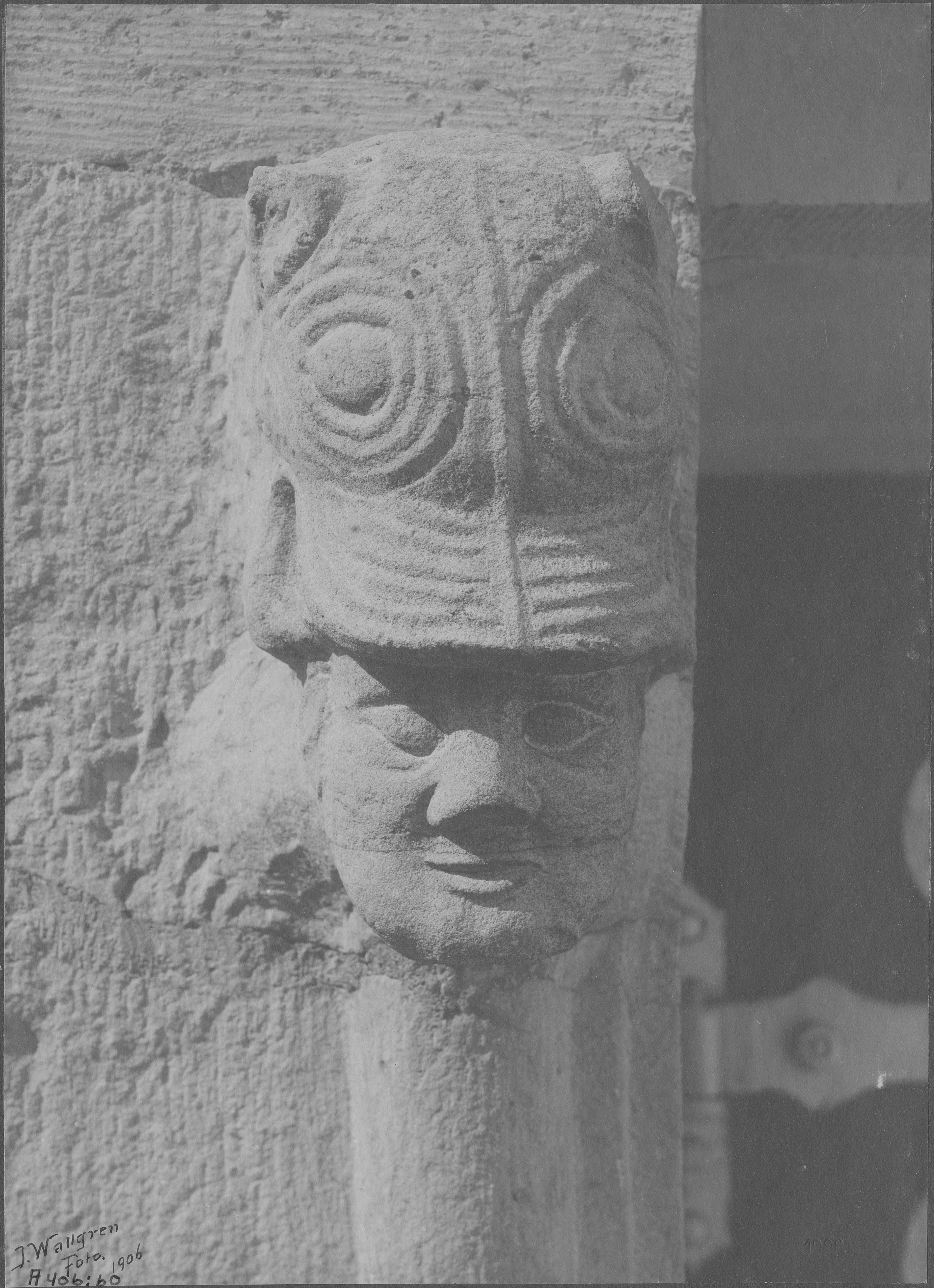 Beskrivning: Detalj av västportalen till södra tvärskeppet. Djurhuvud som gapar över ett människohuvud.