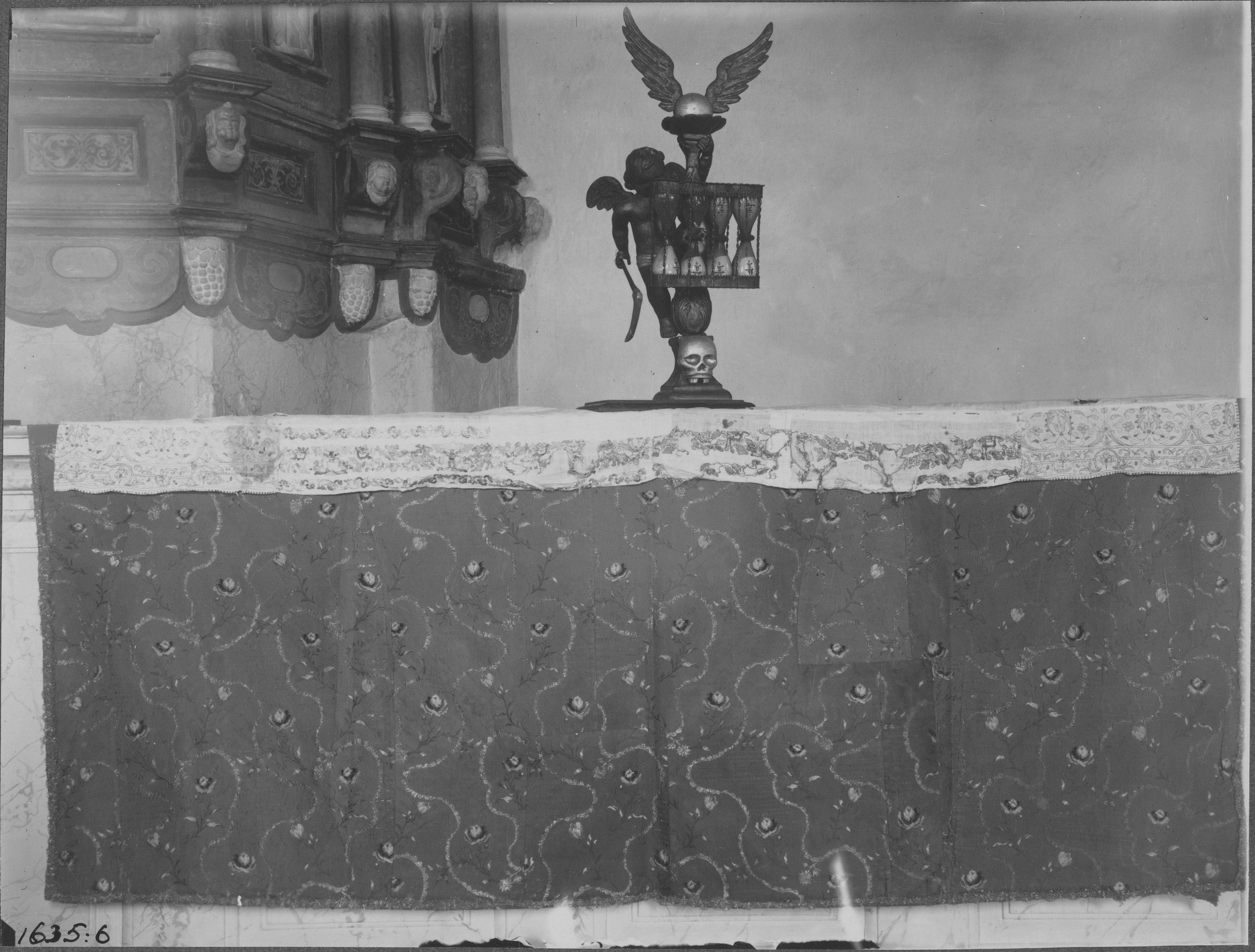 Beskrivning: Antependium av röd sammet med silkesbroderier. Från Snabbinventeringen.