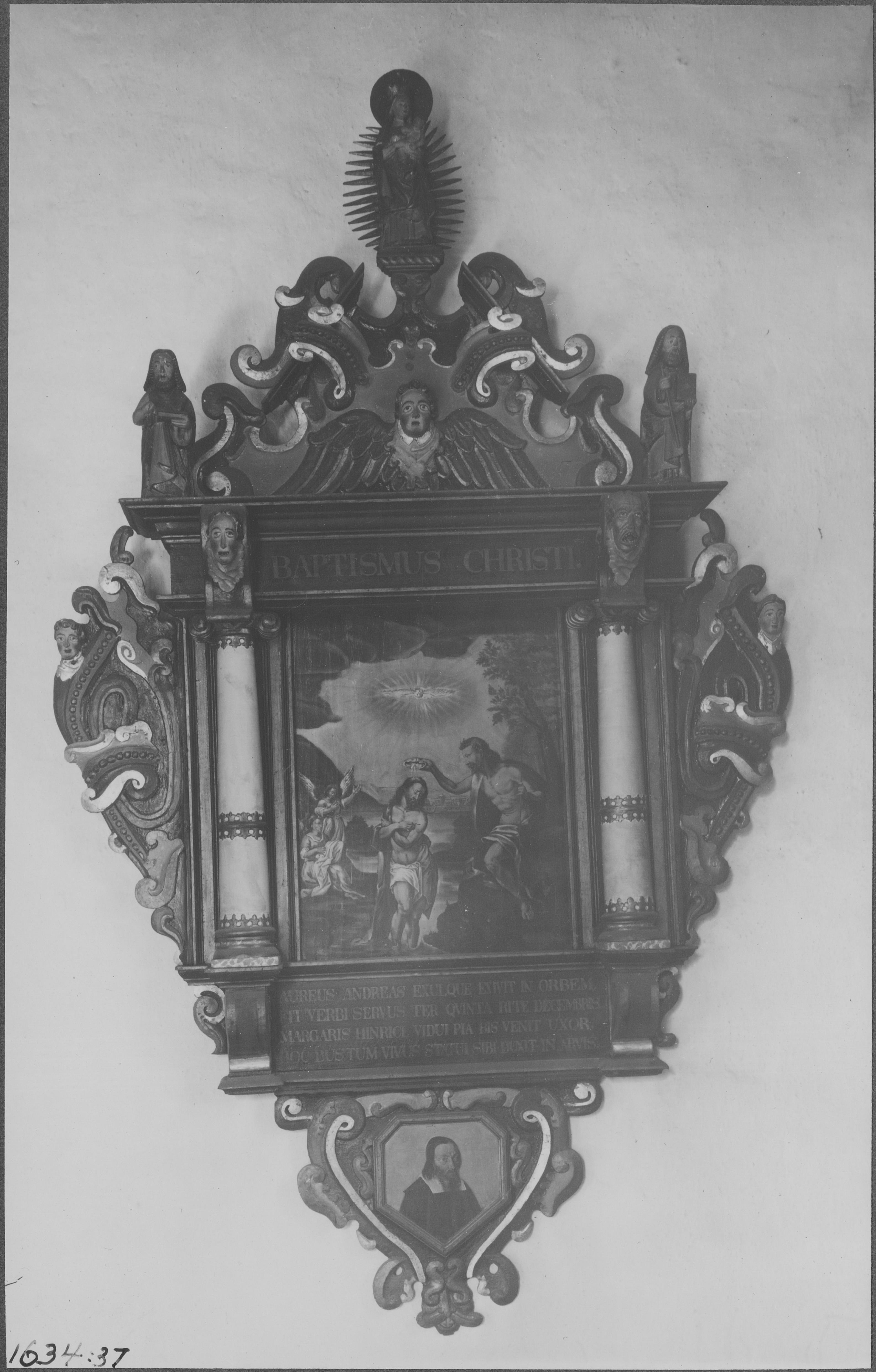 Beskrivning: Jesu dop. Epitafium av snidat och målat trä. Medeltida madonnaskulptur upptill, nedtill ett prästporträtt. Från Snabbinventeringen.