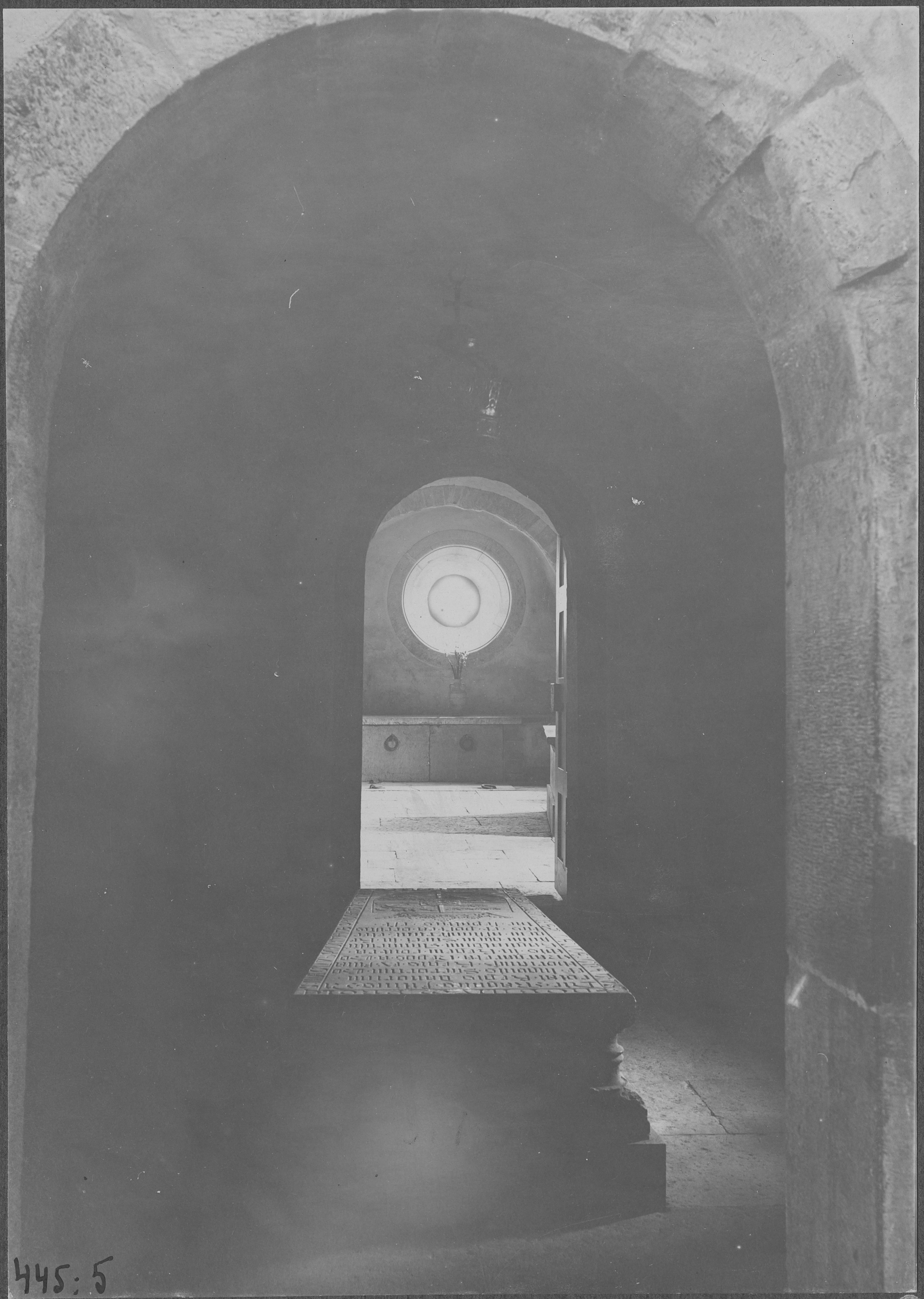 Beskrivning: Blick genom Magnus Nilssons gravkor mot öster och södra korsarmens rundfönster.