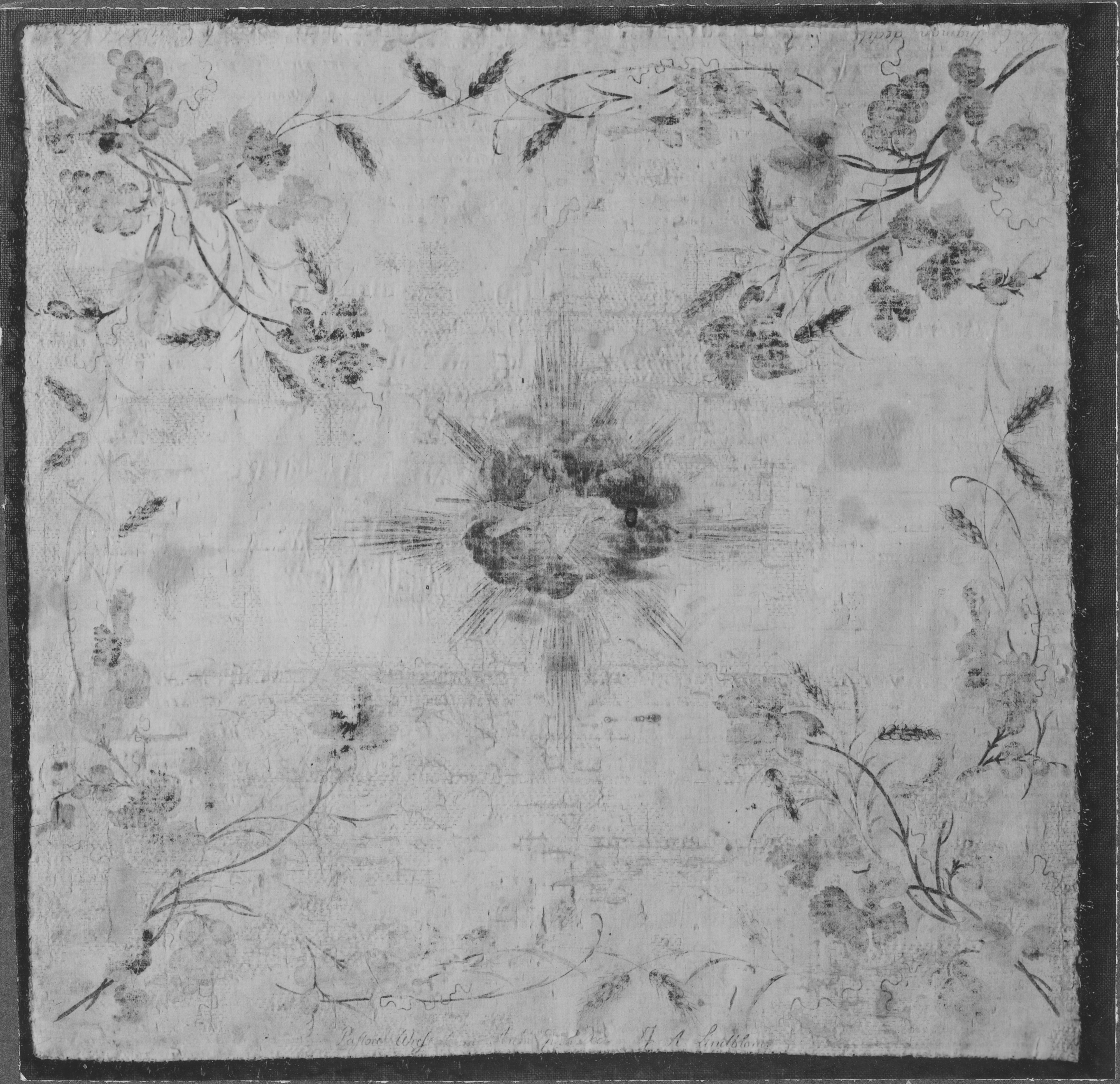 Beskrivning: Kalkkläde av gulvitt siden med silverfrans. Dekorerad med målade vinrankoroch sädesax samt korset och törnekronan i strålkrans. Skänkt 1805. Fotot efter konservering vid Pietas (3884/60)