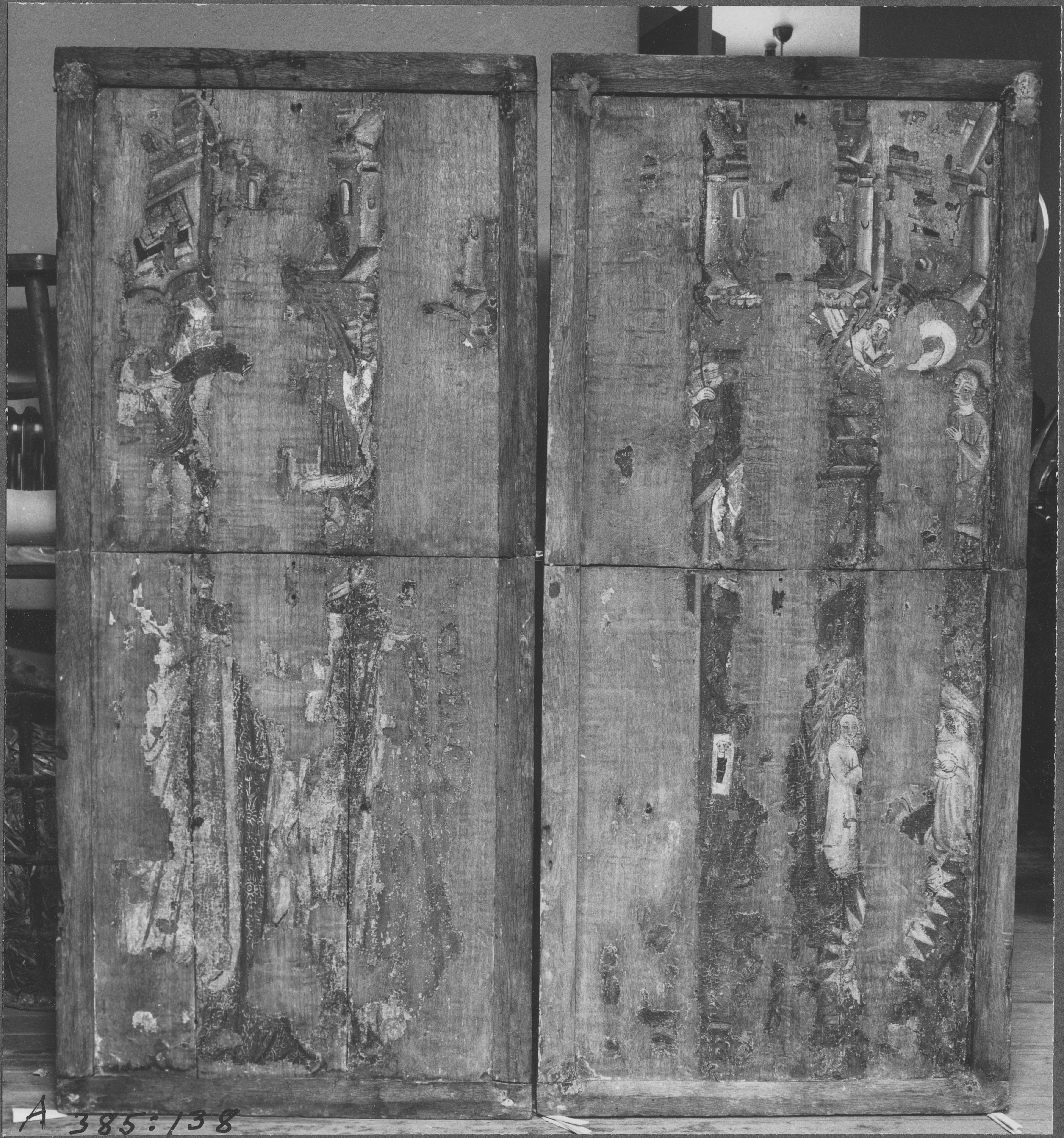 Beskrivning: Baksidorna av altarskåpets flyglar. Efter konservering.