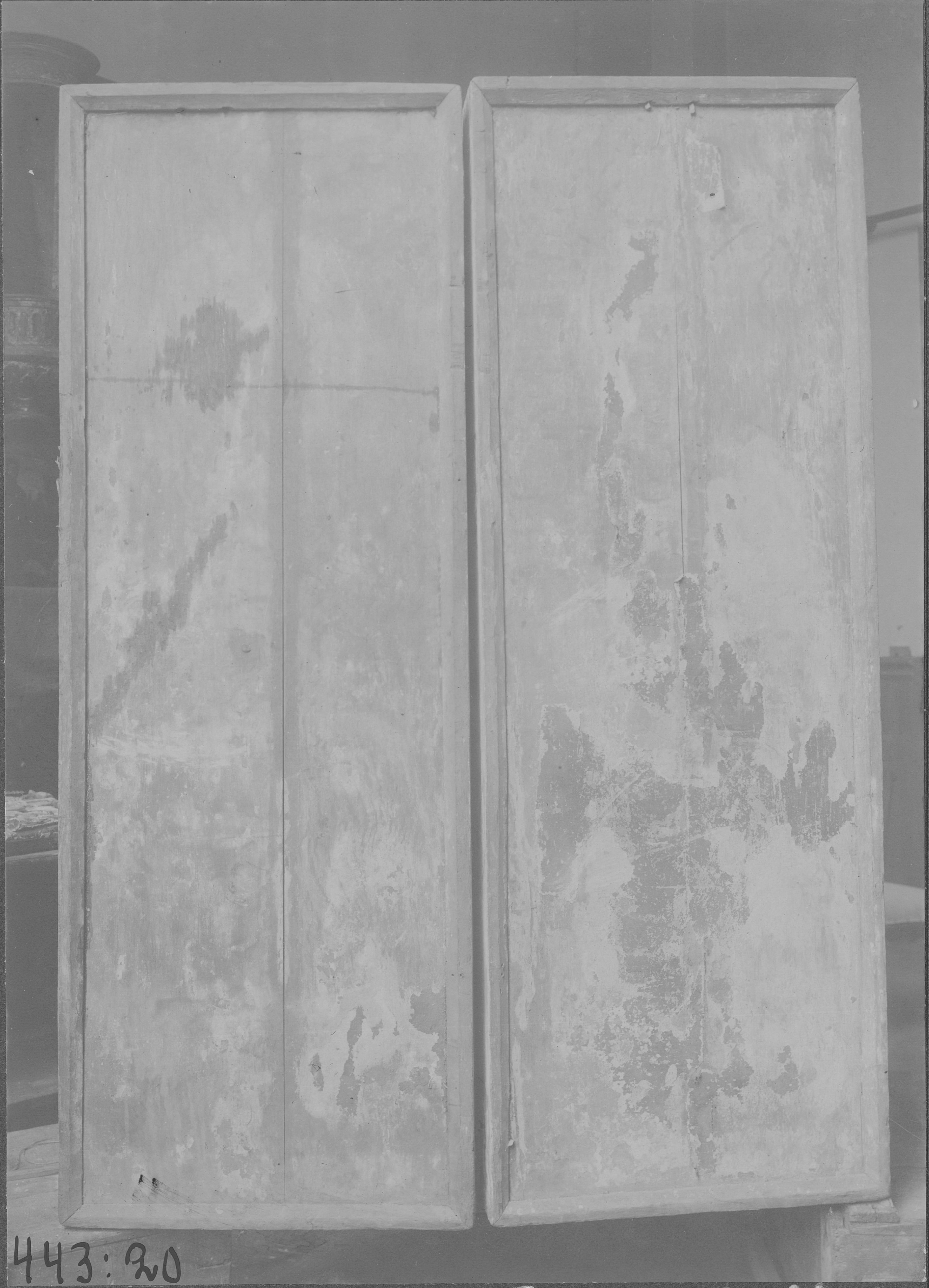 Beskrivning: Dörrar till altarskåp, från 1400-talet, före restaurering.