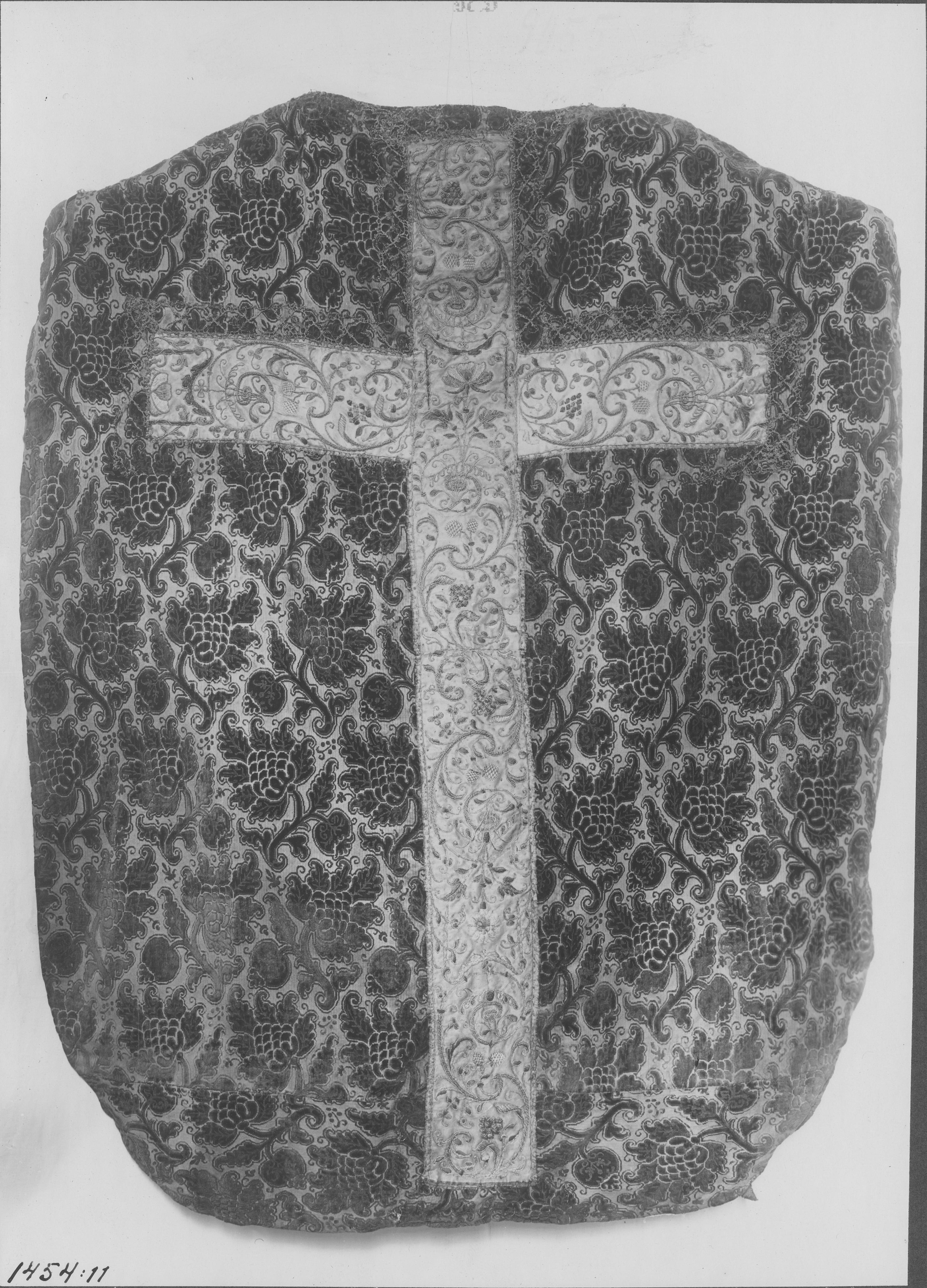 Beskrivning: Mässhake av rödvit sammet från Italien, 1600-talet, nu i Östergötlands museum. Avbildad vid textilutställningen i Stockholm 1929, nr 264.