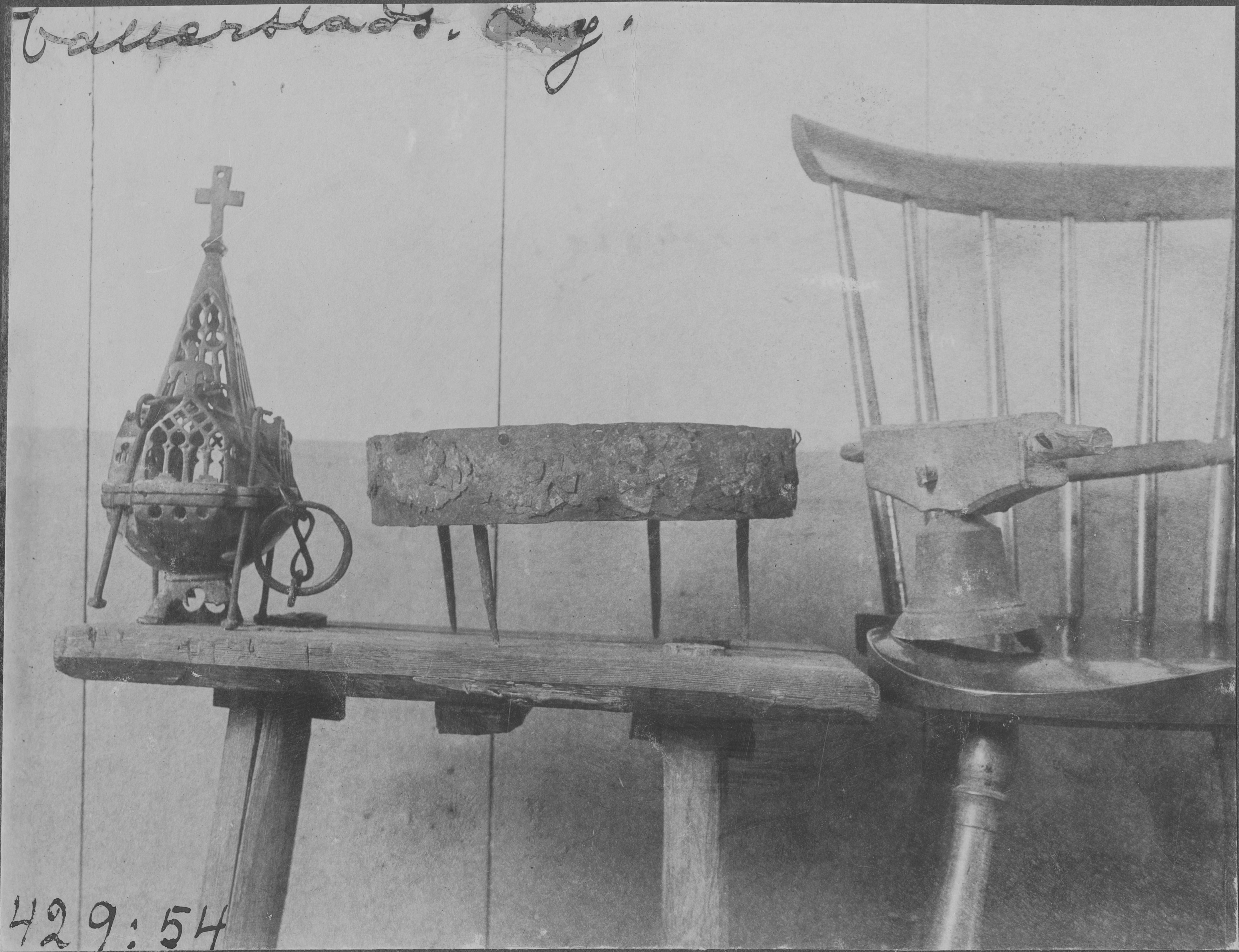 Beskrivning: Rökelsekar av malm, gotisk form. Omkring 1400? Primklocka.