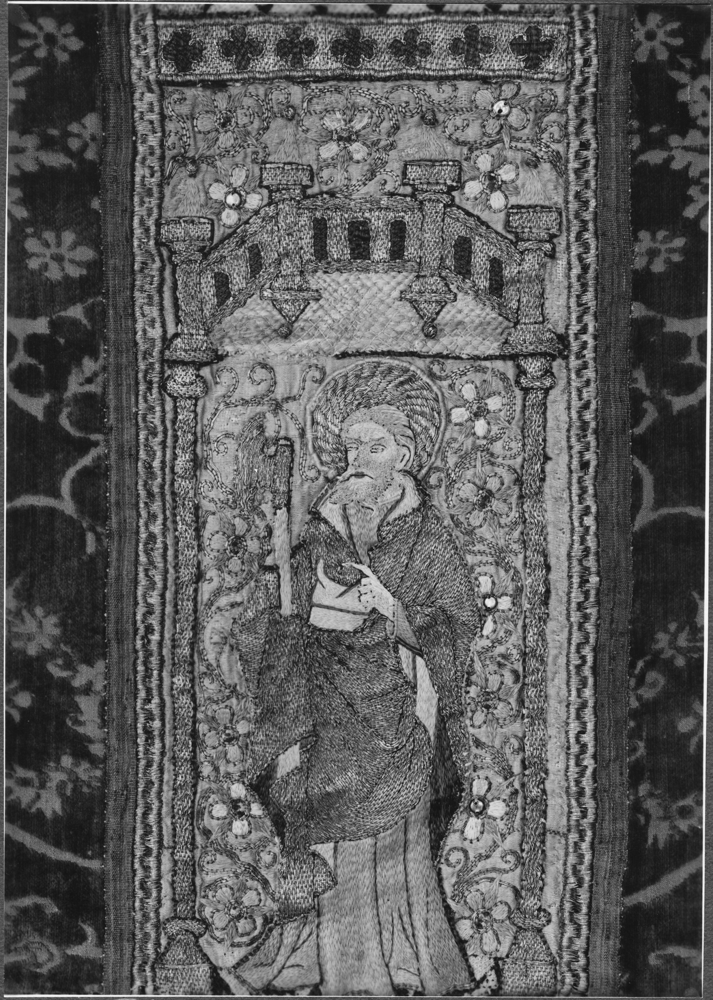 Beskrivning: Mässhake, detalj av det broderade korset på baksidan. Efter konservering.