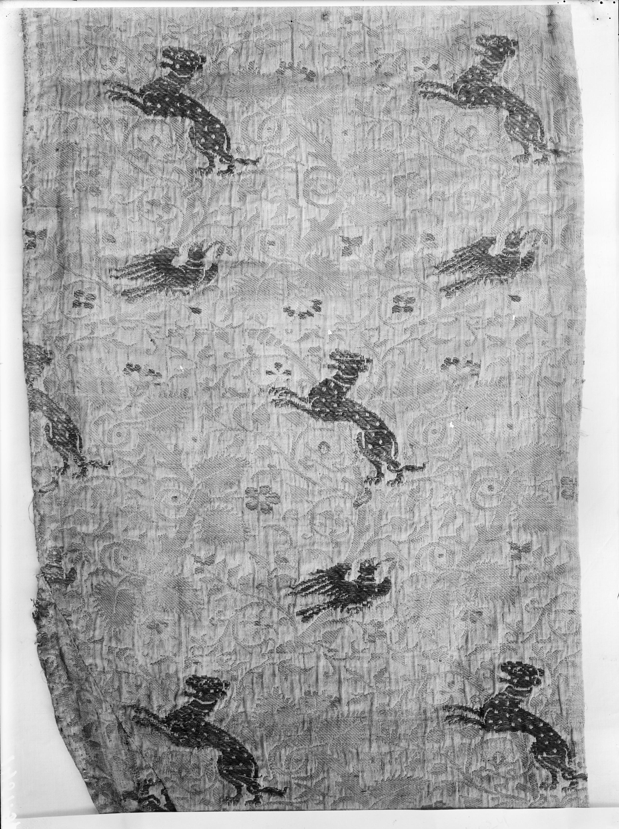 Beskrivning: Mässhake, del av. Membranguldsbrokad, blått lärftfoder. Gåva 1868.