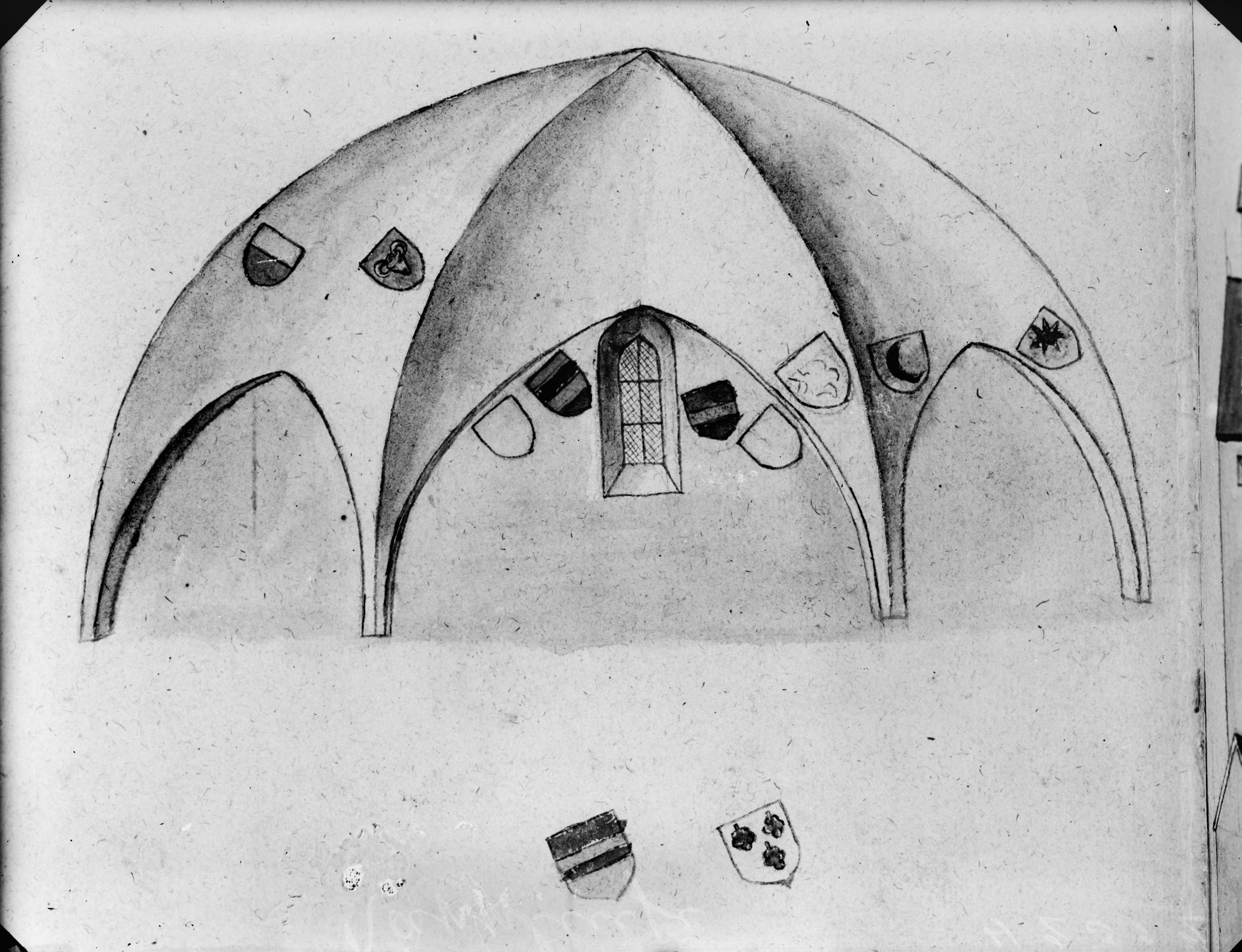 Beskrivning: Teckning av valv med vapen. Ur S. L. Gahm, Archivum Smolandicum. UB.
