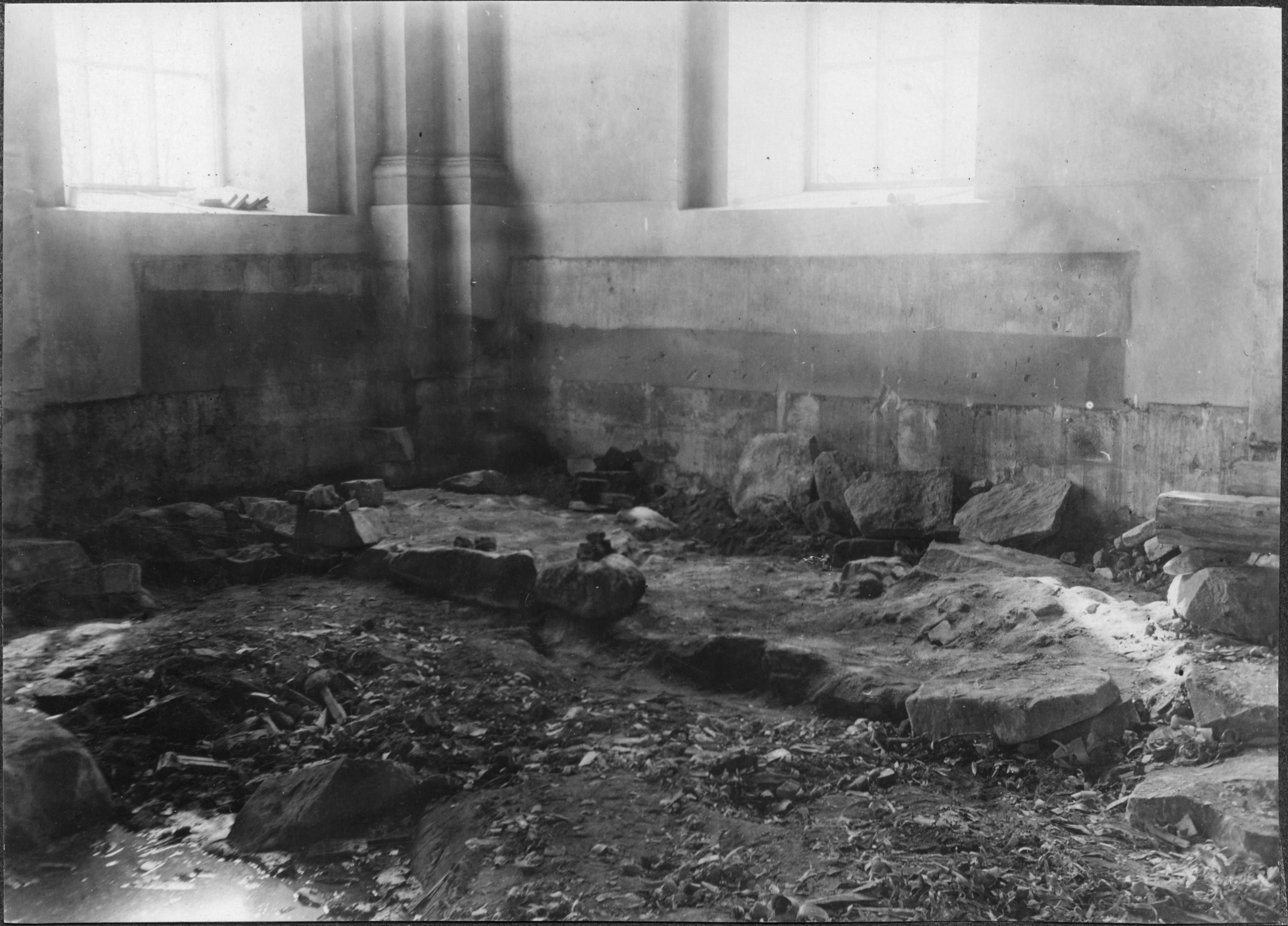 Beskrivning: Östra delen av medeltida kyrkans södra grundmur, från nordväst.