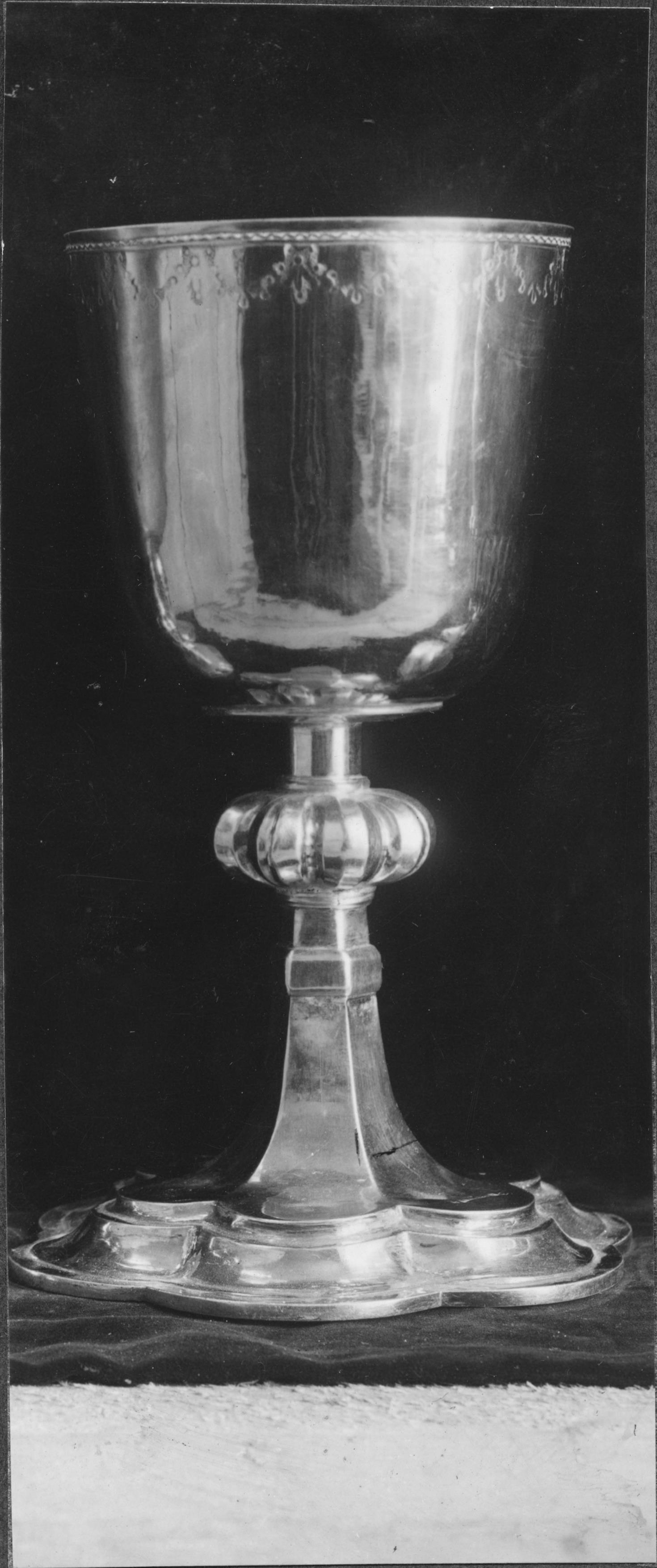 Beskrivning: Kalk av silver, förgylld fot, 6-passformad, snabbinv.