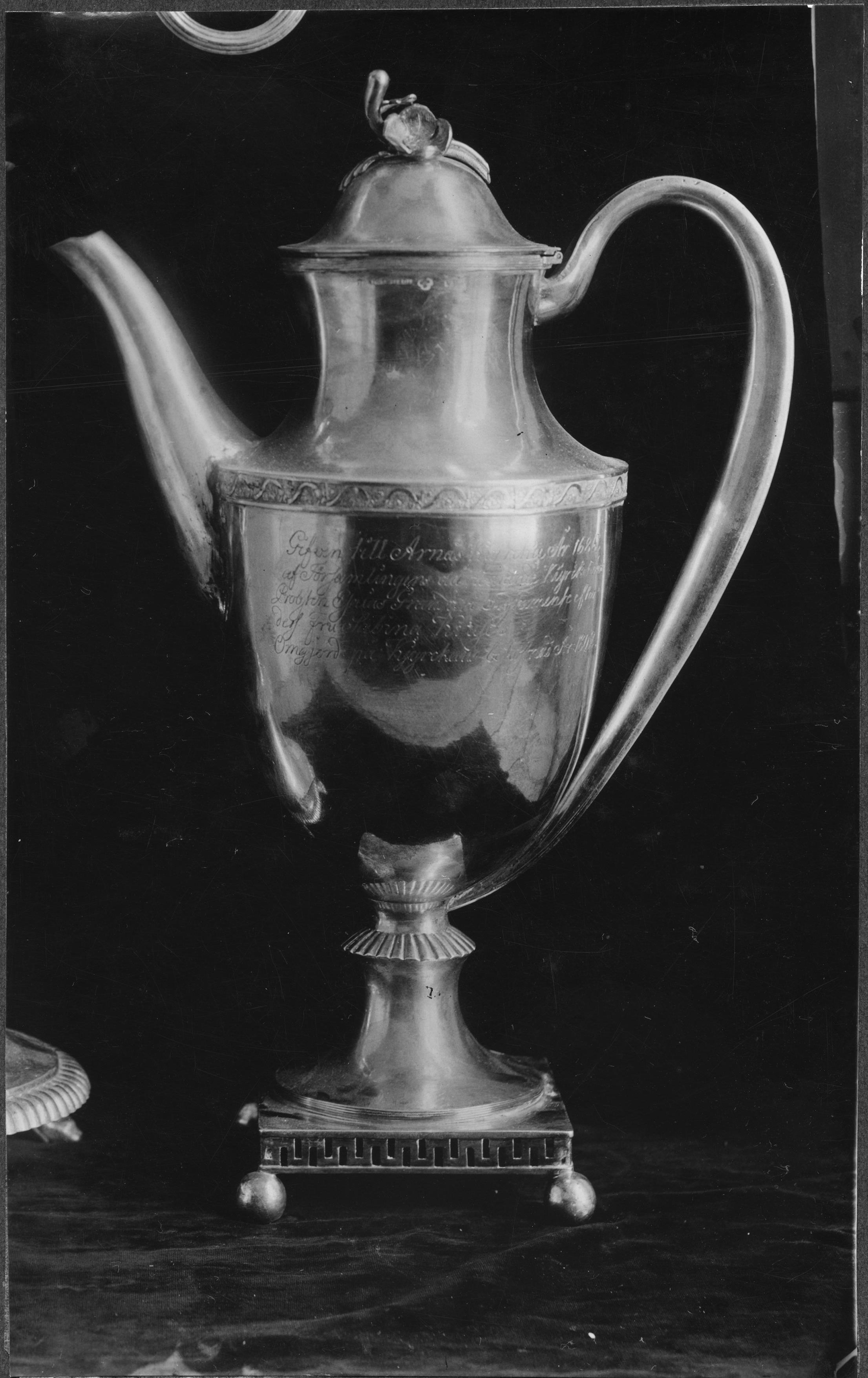 Beskrivning: Kanna, av silver. Fyrasidig fot med genombrutet meanderornament, står på fyra kulor. Med inskrift, snabbinv.