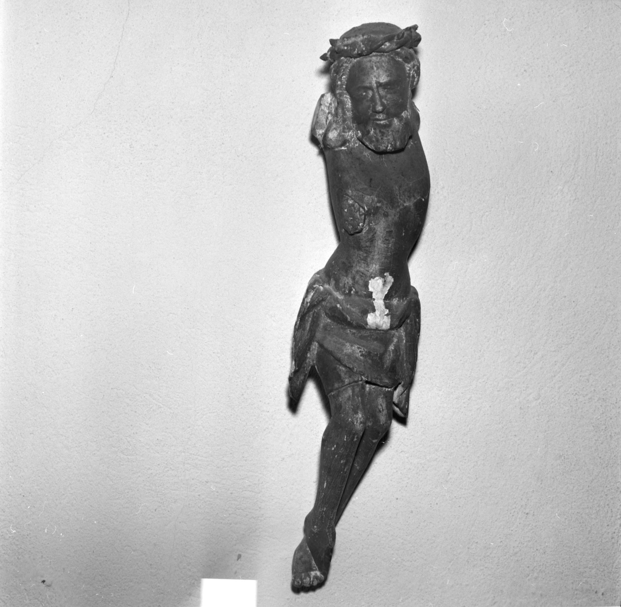 Beskrivning: Krucifix. Träskulptur. Hår, skägg och höftkläde bronserade. Kors och armar saknas, höger fot avbruten. H. 48 cm. 1400-talet.