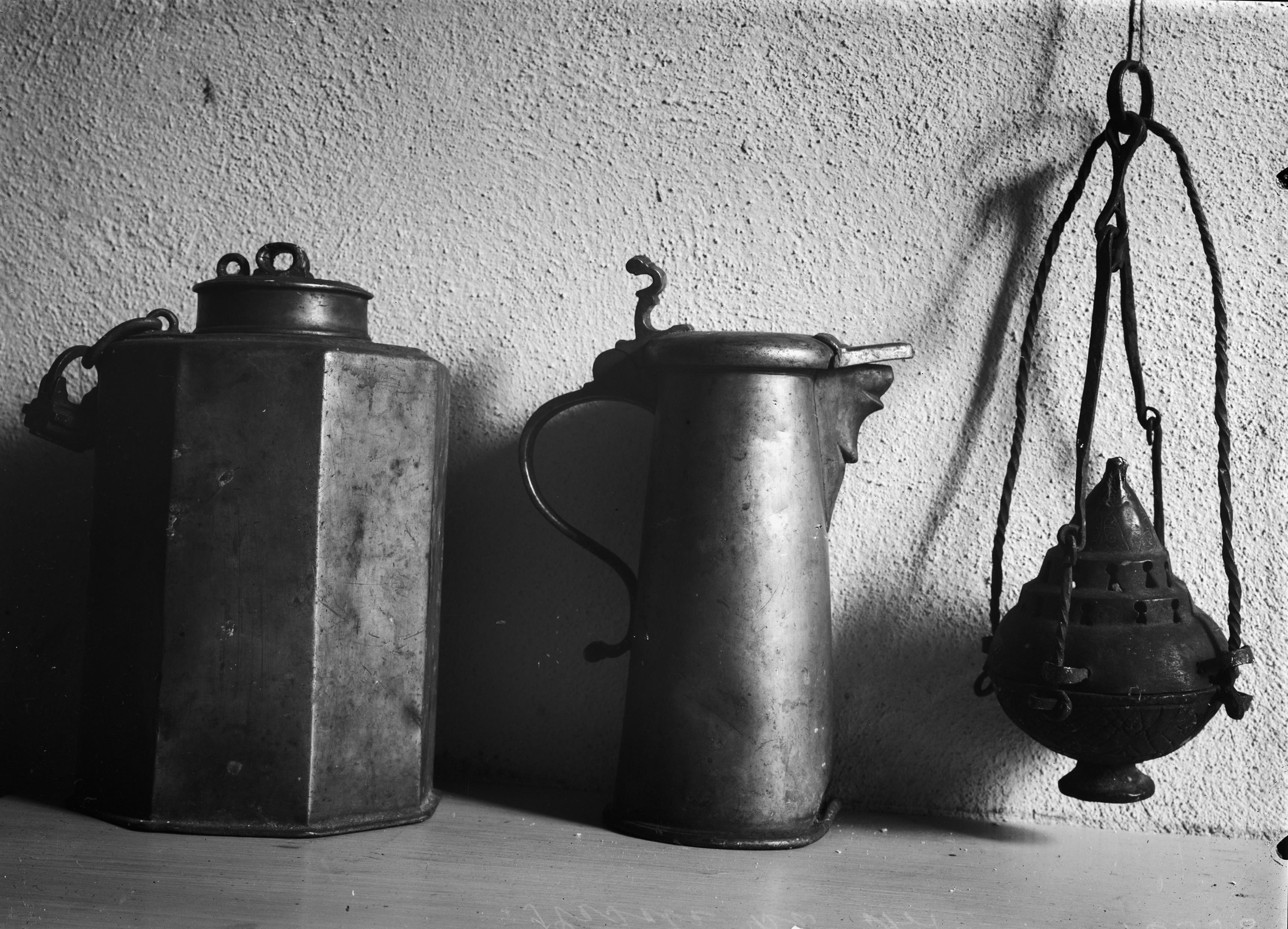Beskrivning: Kanna och stop av tenn. Stopet med stämpel 1696. Rökelsekar av malm, koniskt lock med gravering och nyckelhålsliknande hål. Medeltida. Snabbinventering.