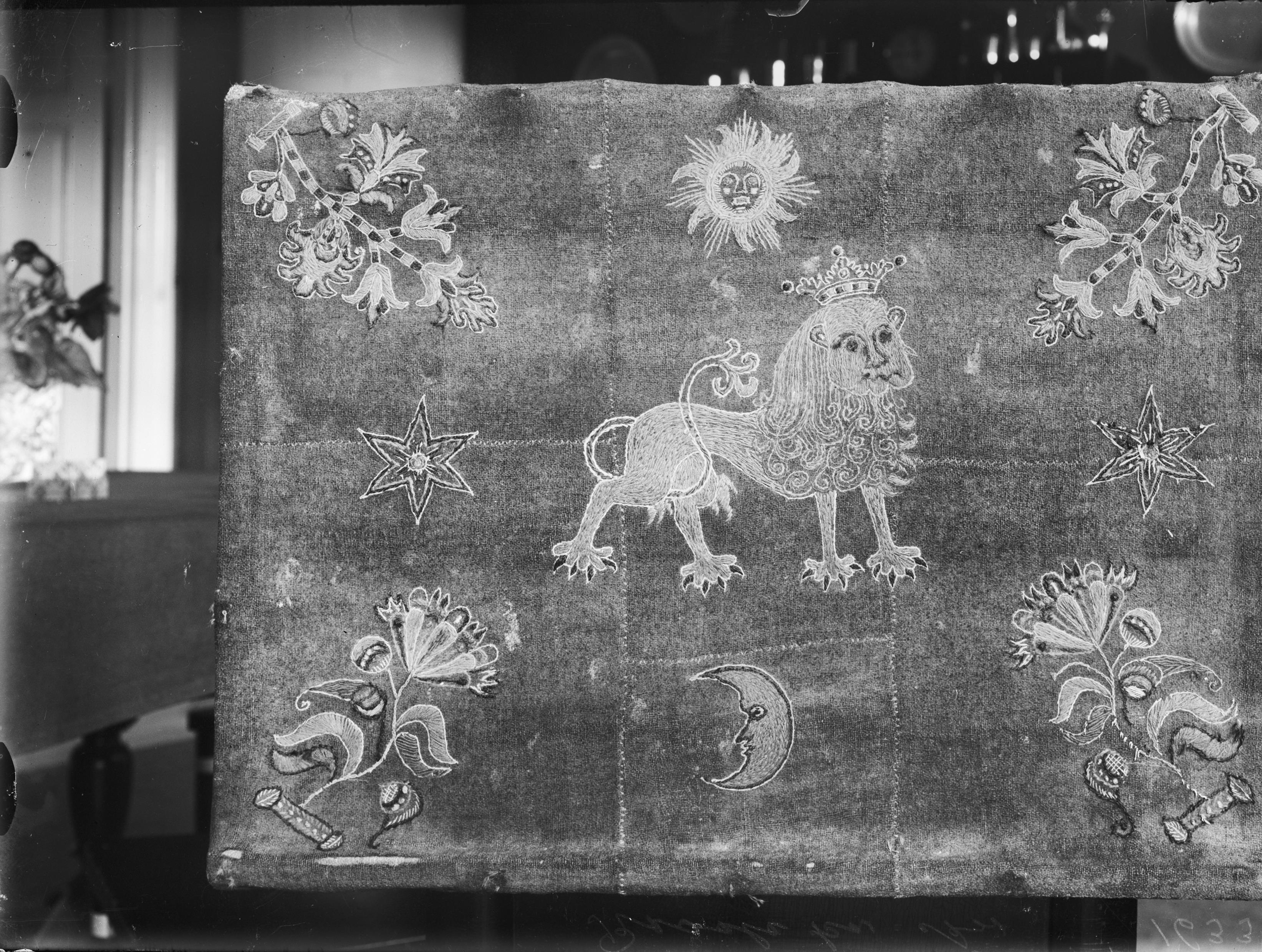 Beskrivning: Bokpall av rött kläde. Broderi i guld, brunt, svart och vitt; i mitten krönt lejon. Pallens överyta 38x50 cm. Omkr. 1600. Snabbinventering.