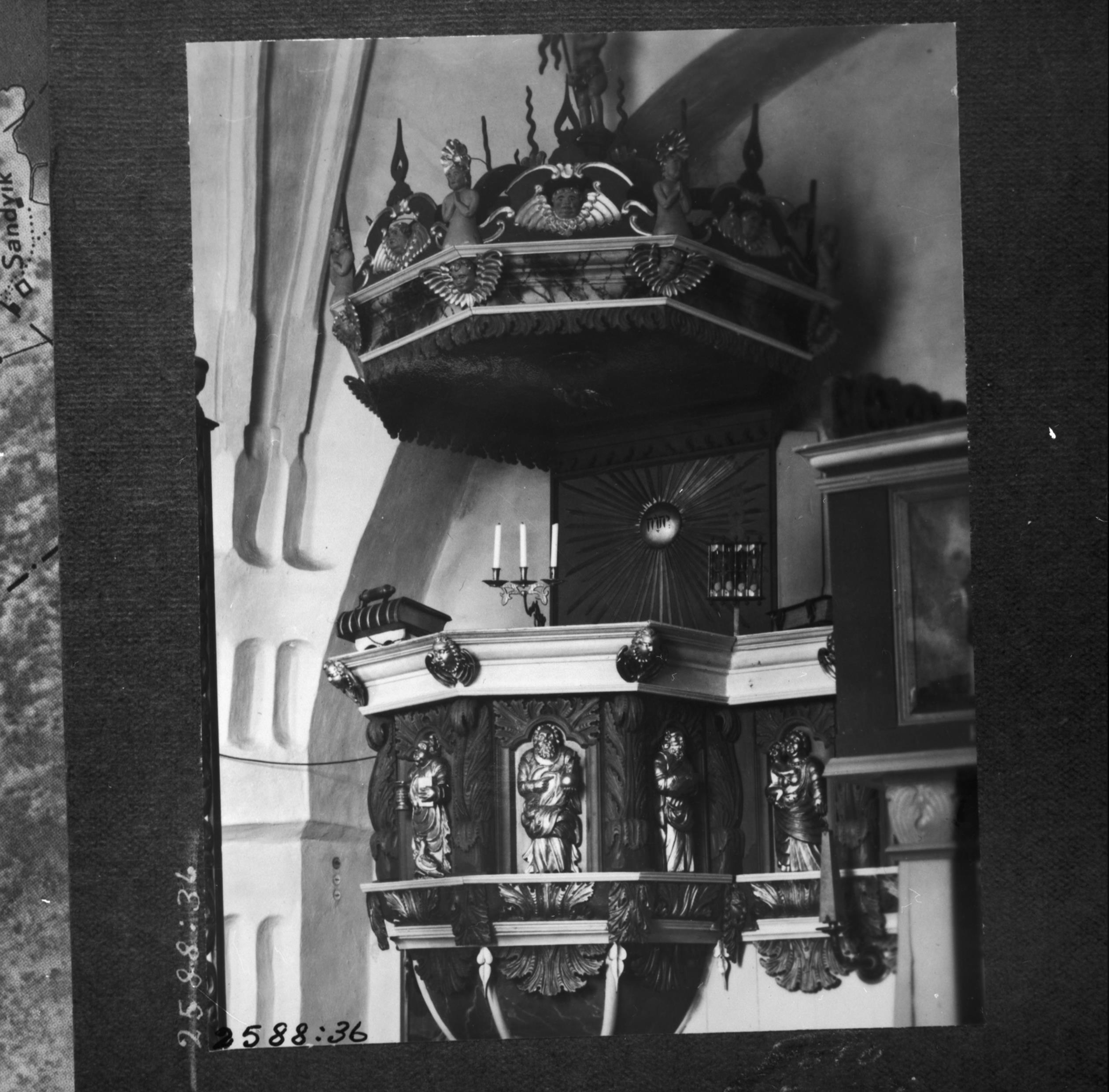 Beskrivning: Predikstol med ljudtak, uppförd 1727.