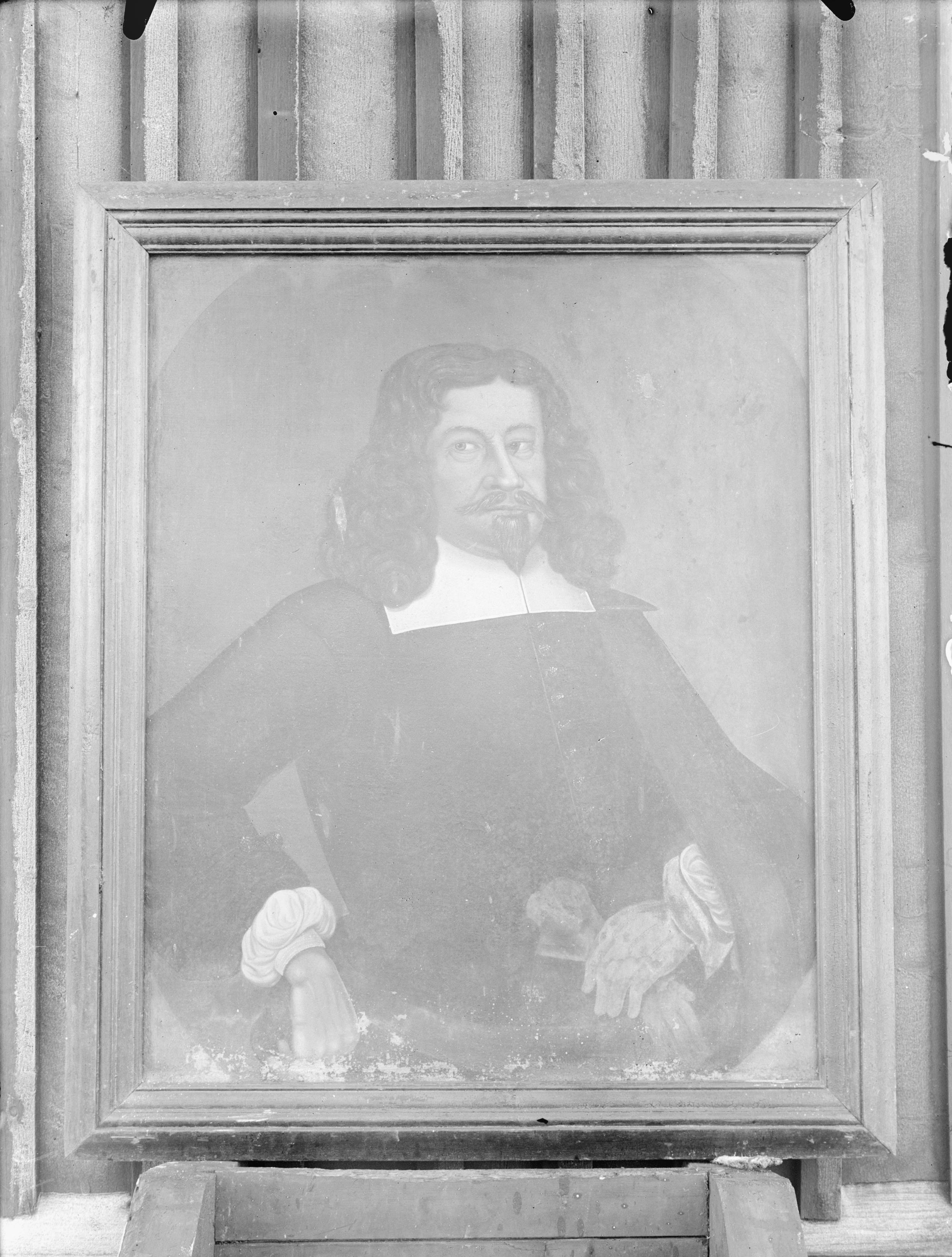 Beskrivning: Porträtt, olja på duk. Midjebild av man med svart peruk, pipskägg och mustascher, i svart dräkt. 1600-talet (snabbinv).