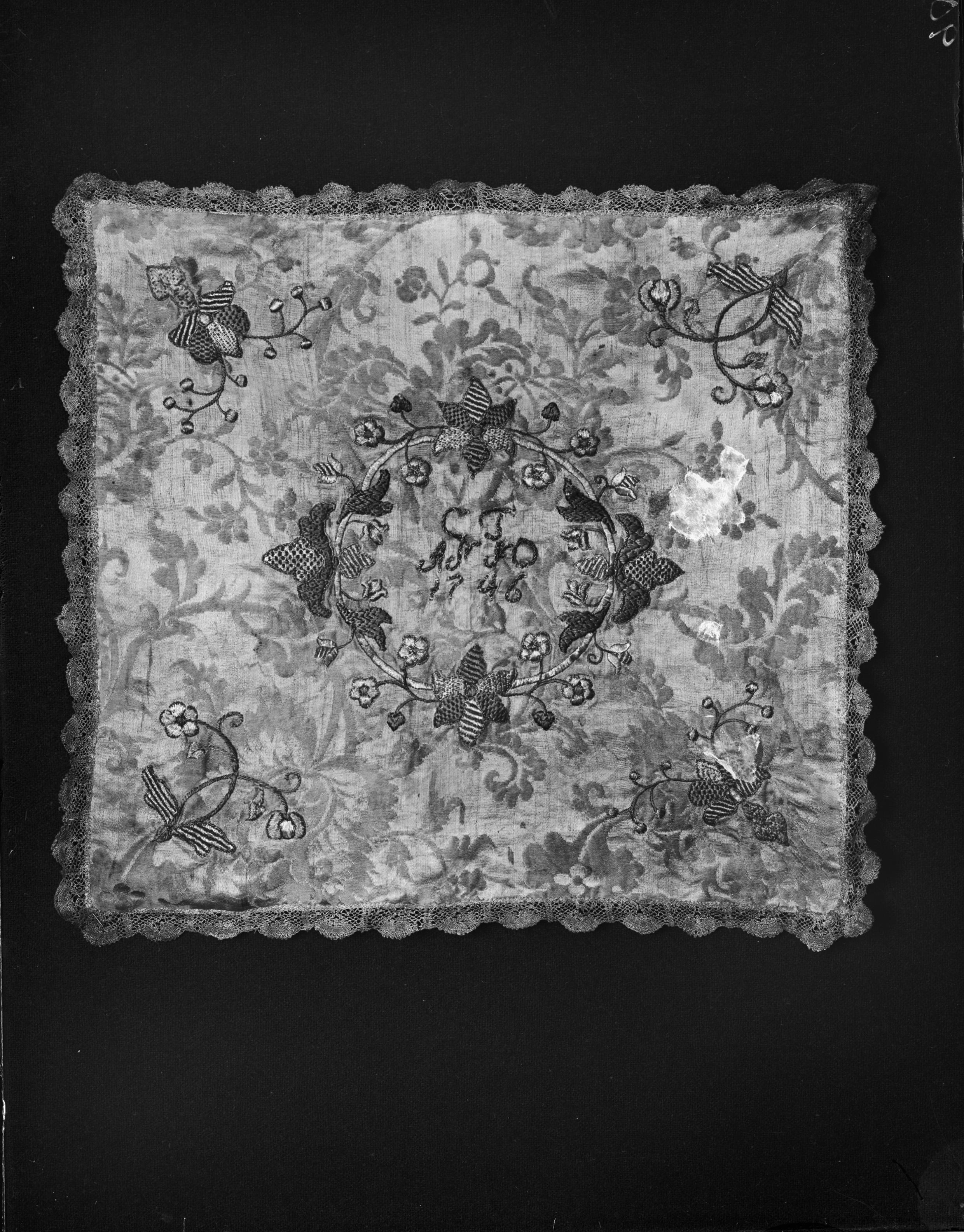 Beskrivning: Kalkduk, av rött mönstrat siden med broderi i guld, silver och silke. Inskrift CF AS SO 1746, snabbinv. Före renovering.