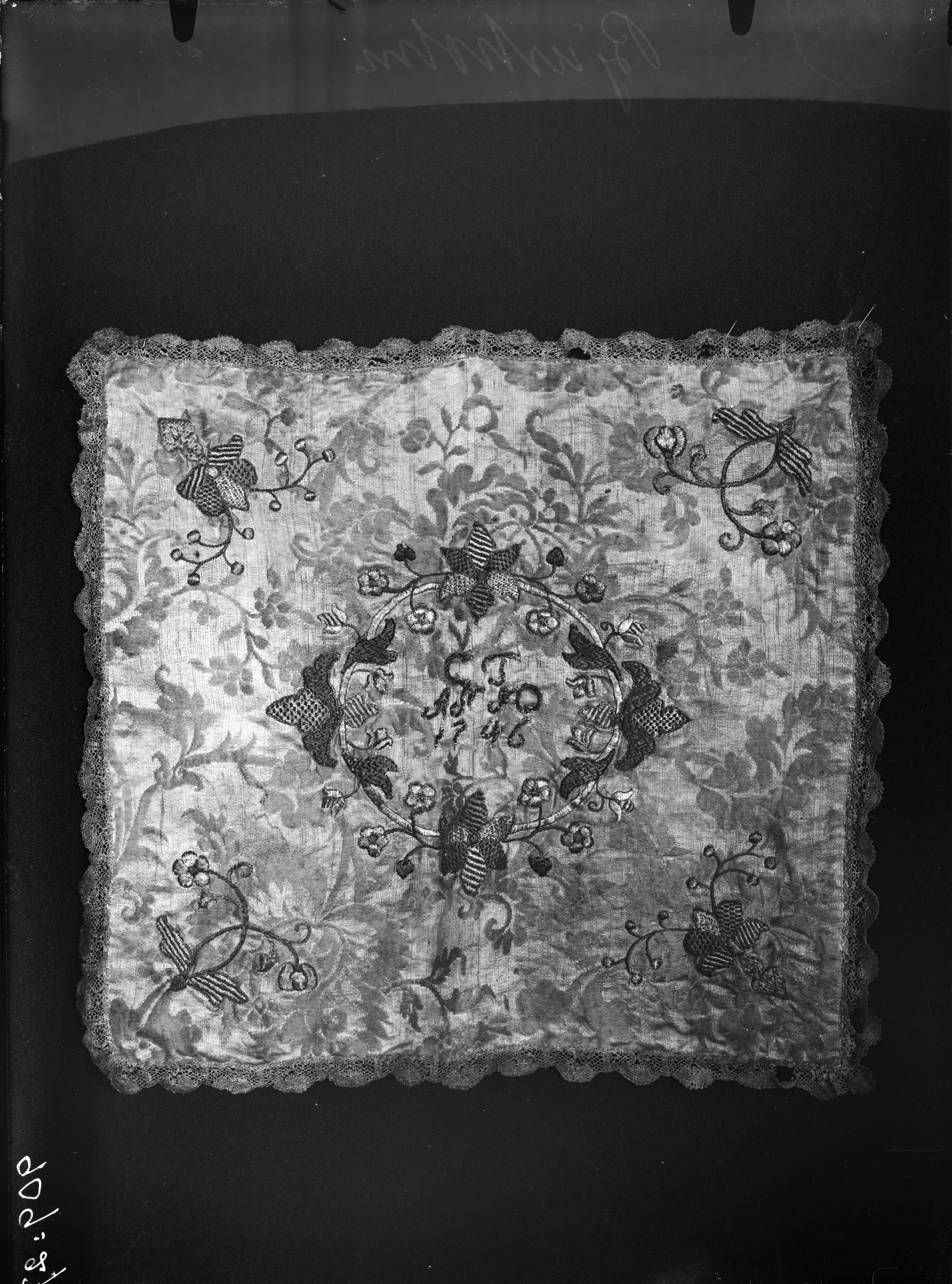 Beskrivning: Kalkduk, rött mönstrat siden med broderi i guld, silver och silke. Inskrift CF AS SO 1746, snabbinv. Efter renovering.