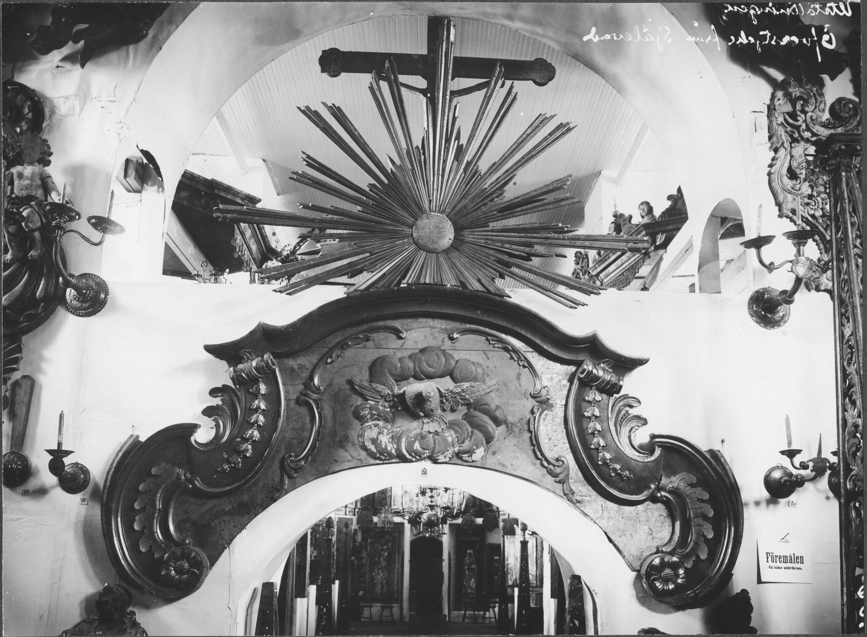 Beskrivning: Altaruppsats av trä. Omramning kring ett altarfönster. Överstycke. 1700-talet. Härnösandsutst. 1912 nr. 156.