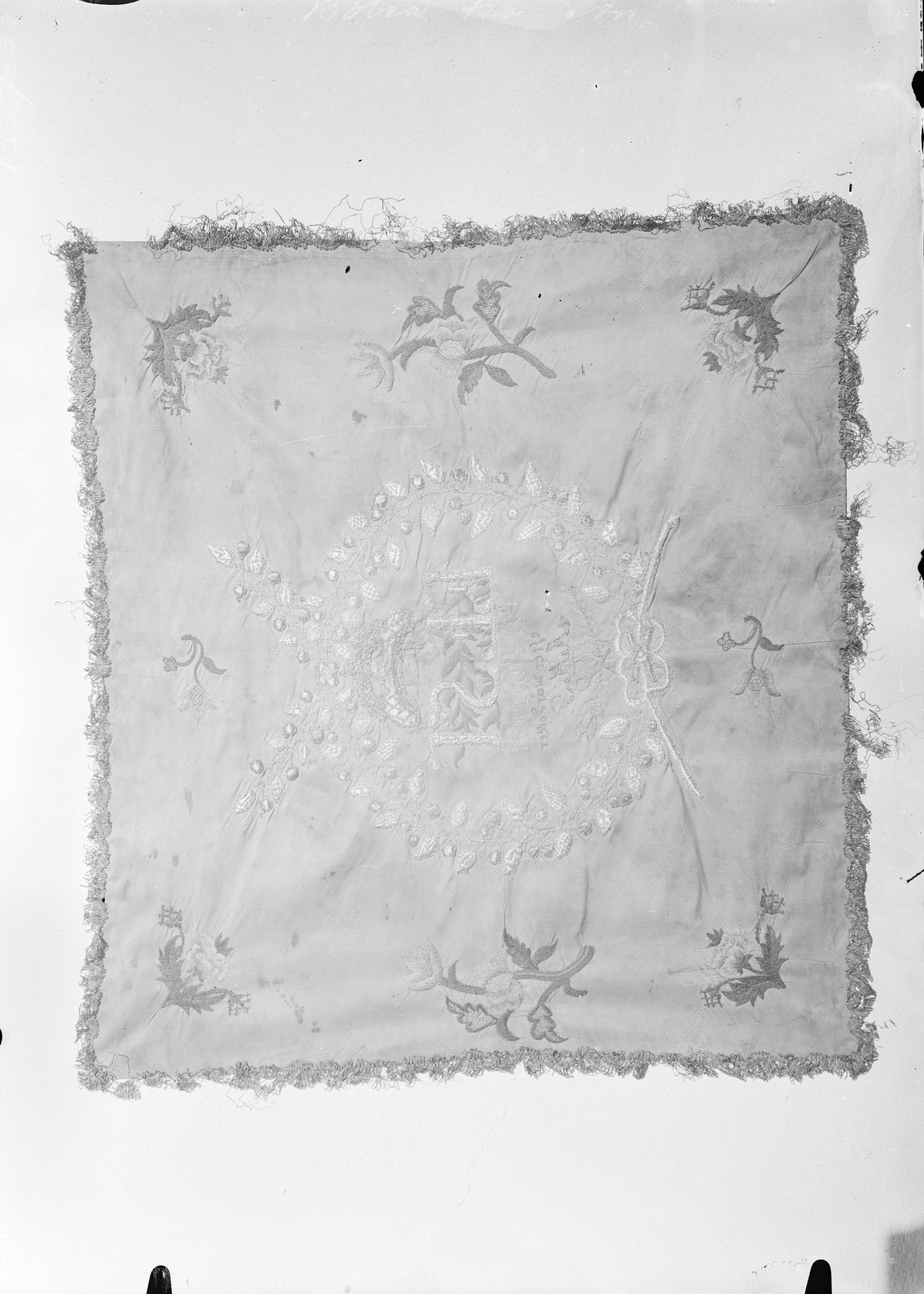 Beskrivning: Kalkkläde av blått siden med broderi. Inskrift samt krona, korslagda bladkvistar och rosenkvistar, guldspets vid kanten, snabbinv.