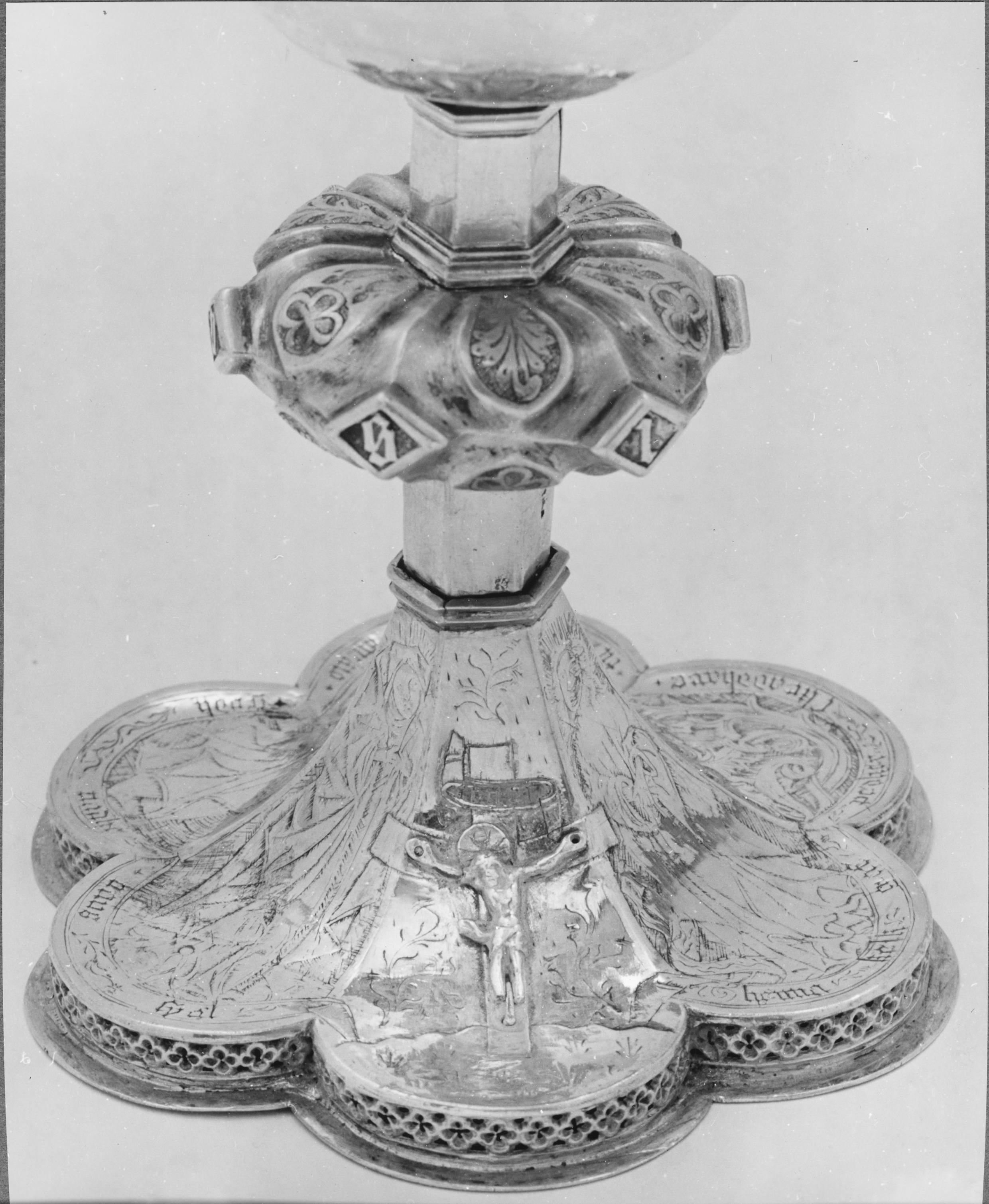 Beskrivning: Kalk av silver, förgylld. Detalj av skaft och 6-passformig fot med ornering. Fastnitad Kristusbild på graverat kors.