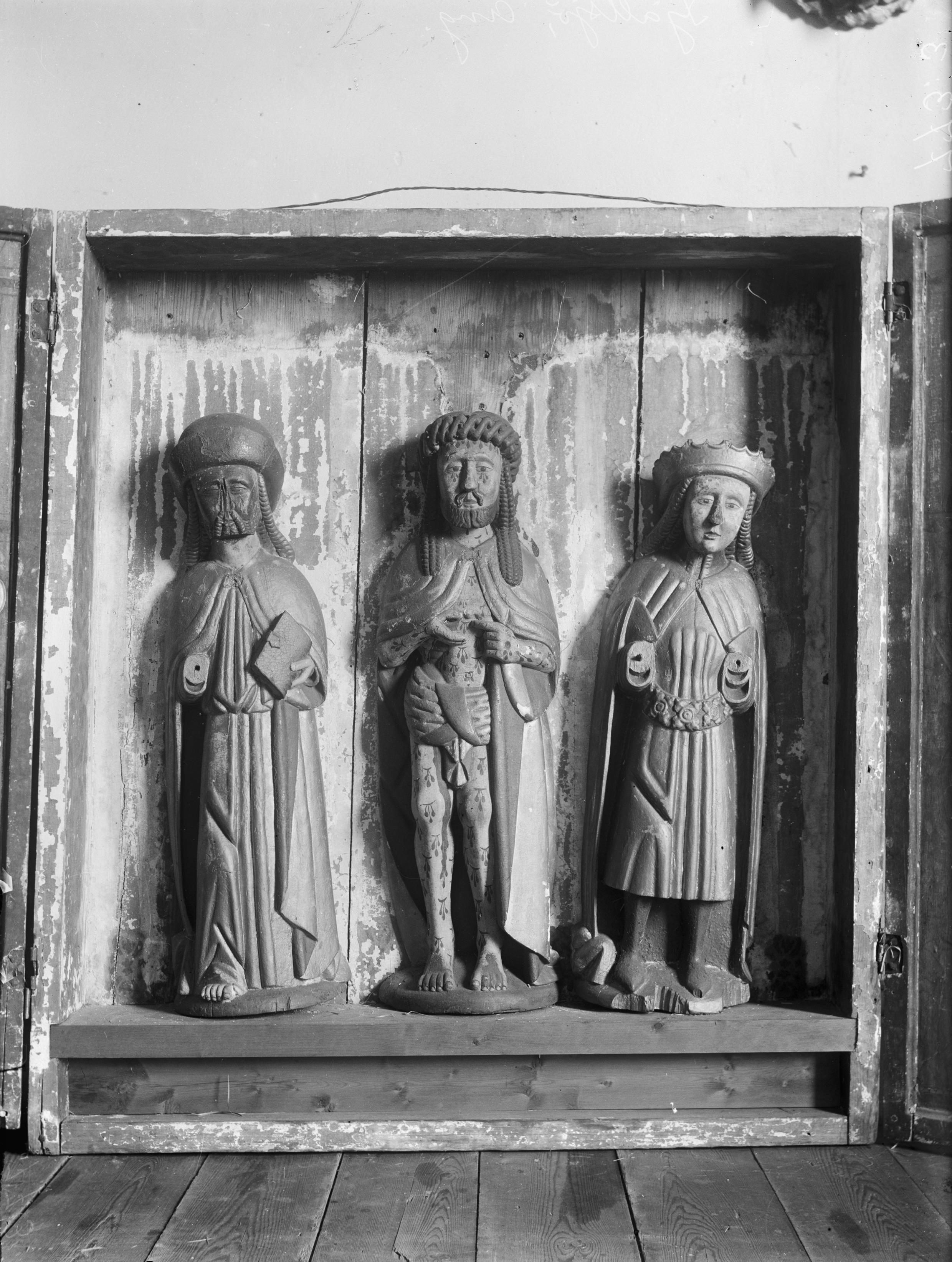 Beskrivning: Altarskåp, träskulptur. Tre figurer: Kristus som smärtornas man visande sina sår, St Olov och Jacob dä. 1500-talets början, snabbinv. Före konservering.