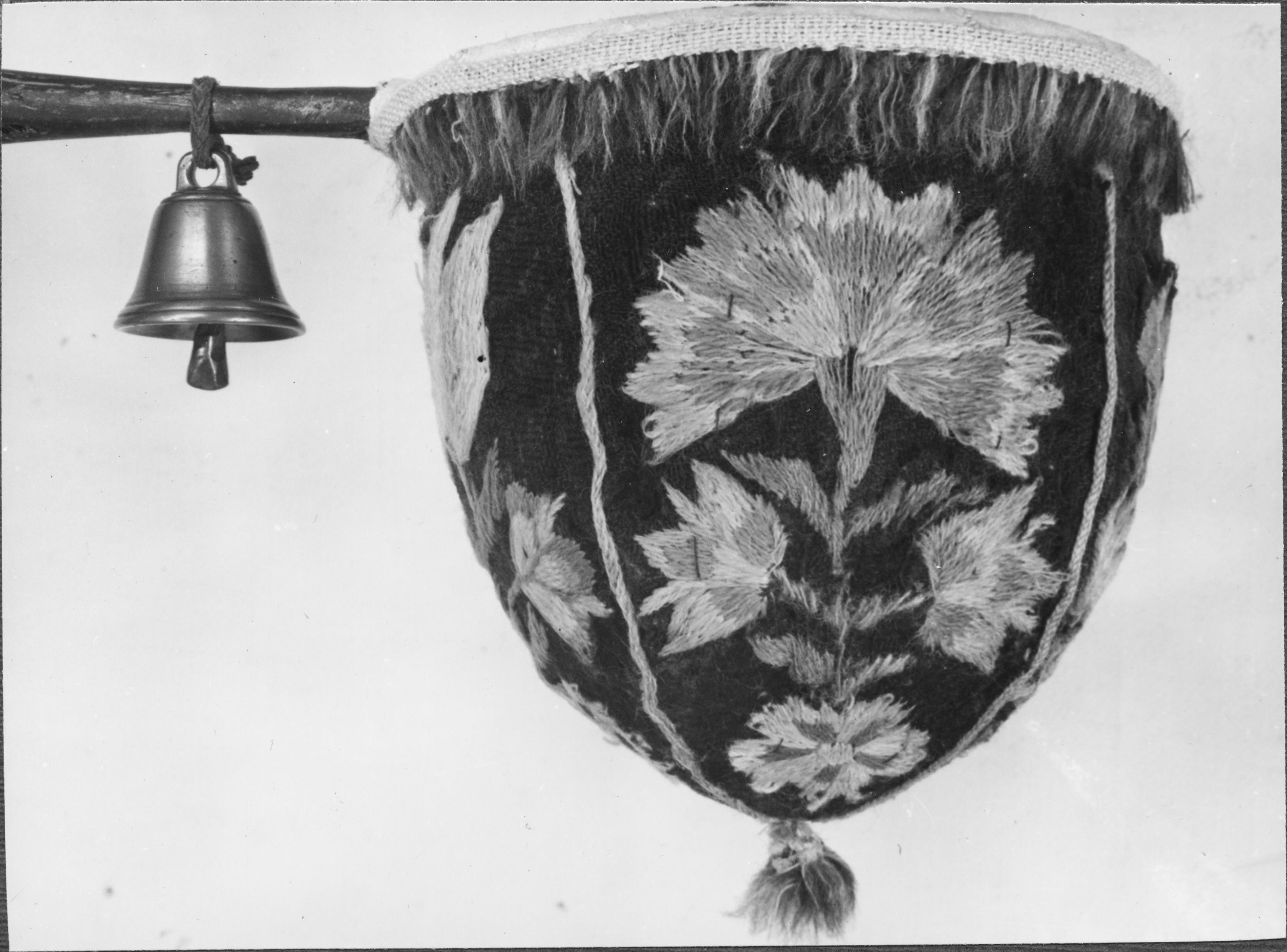 Beskrivning: Håv. Blombroderi i vitt, rött, grönt, gult och blått mot svart yllebotten. Inskrift: "EIS CH 1768", snabbinv.