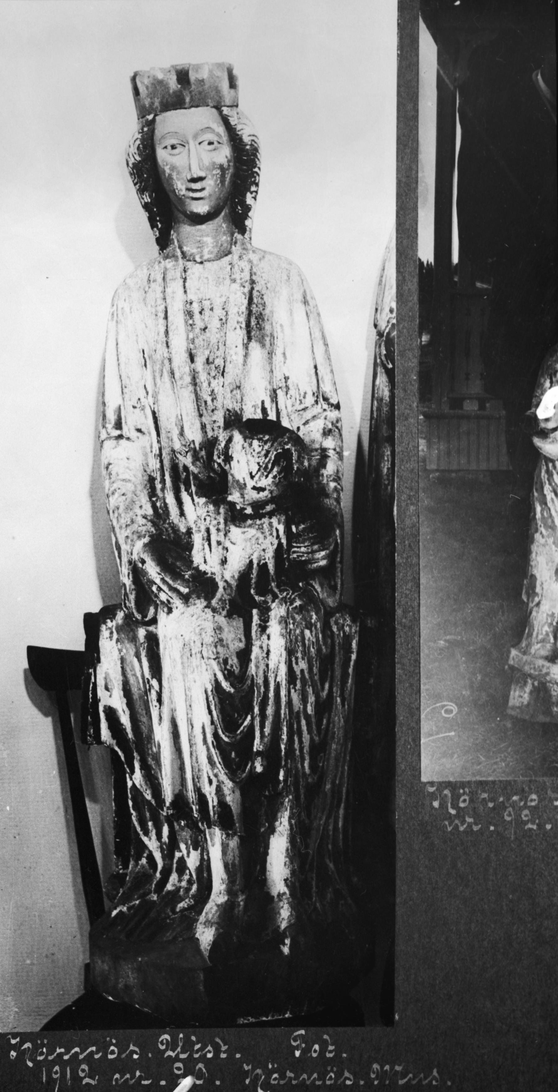 Beskrivning: Madonna med barnet. Skulptur i ek. Barnets huvud och kronans taggar saknas. Färgen skadad: rött, blått, gult, grönt. H. 104 cm. Omkr. 1300. Härnösandsutst. 1912 nr. 20.