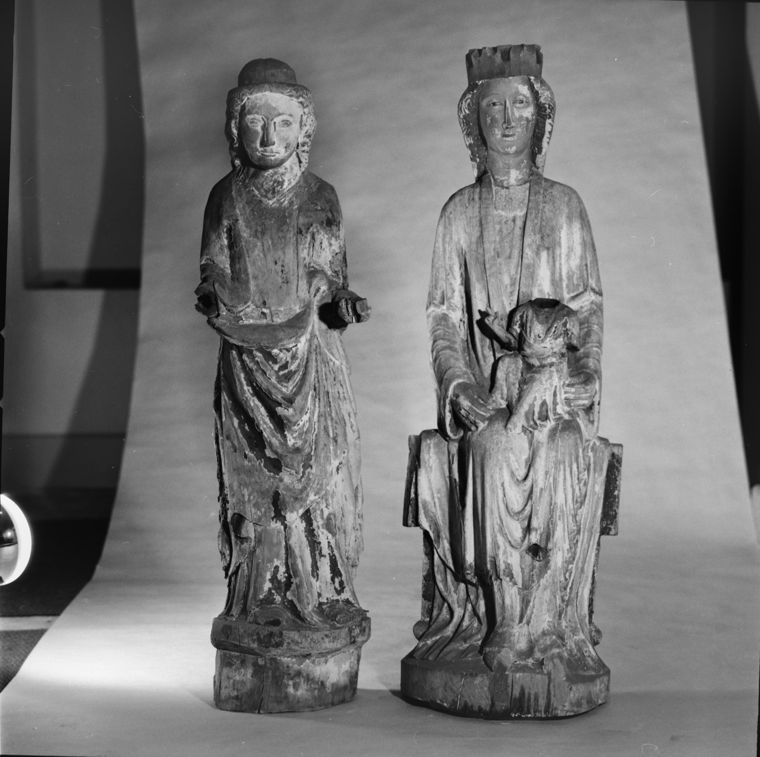 Beskrivning: Madonna med barnet. Skulptur i ek. Barnets huvud och kronans taggar saknas. Färgen skadad: rött, blått, gult, grönt. H. 104 cm. Omkr. 1300.