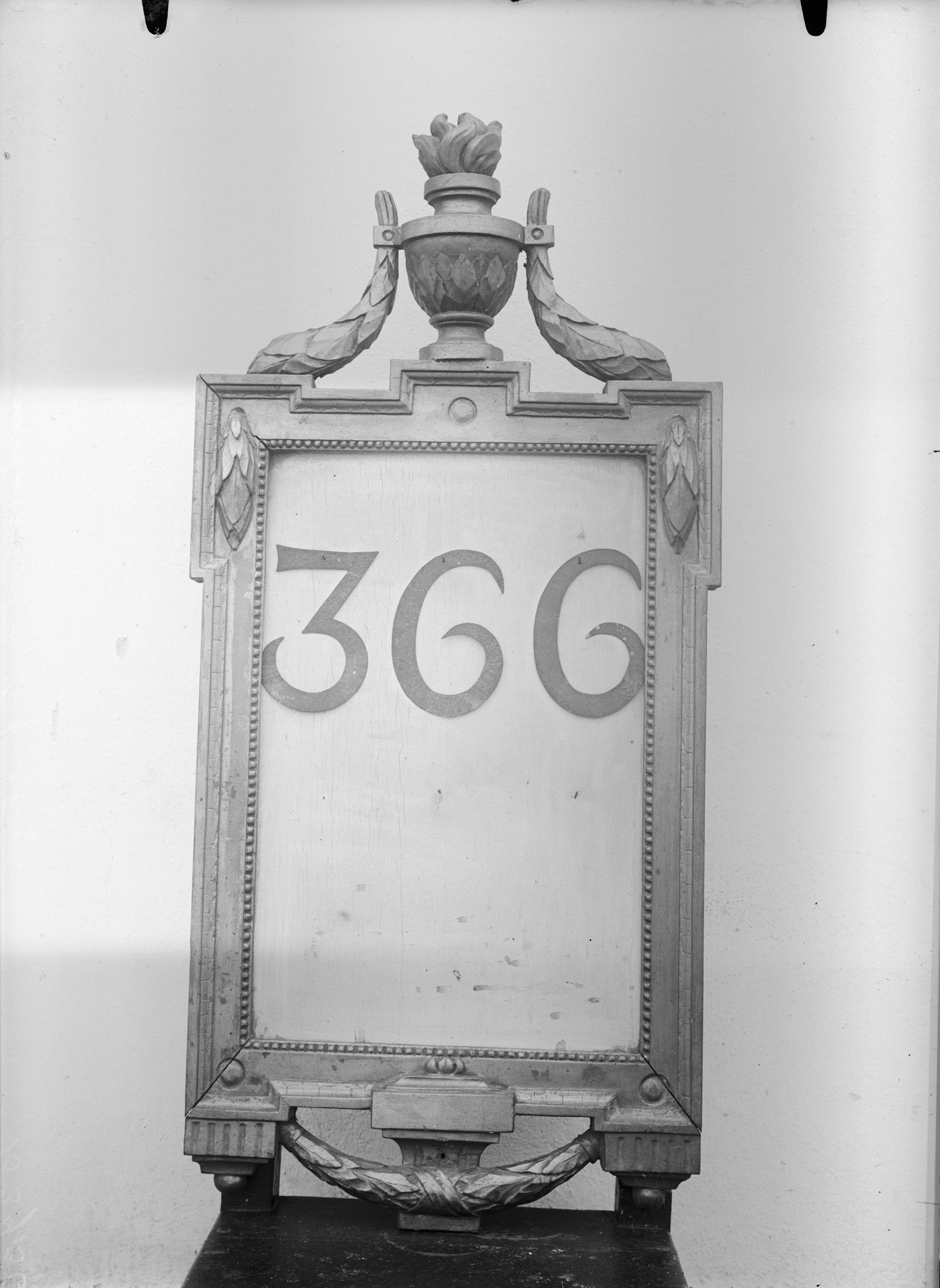 Beskrivning: Nummertavla, av trä. Förgylld ram i gustaviansk stil. Upptill eldsurna och girlang, nedtill girlang. 1700-talets slut, snabbinv.