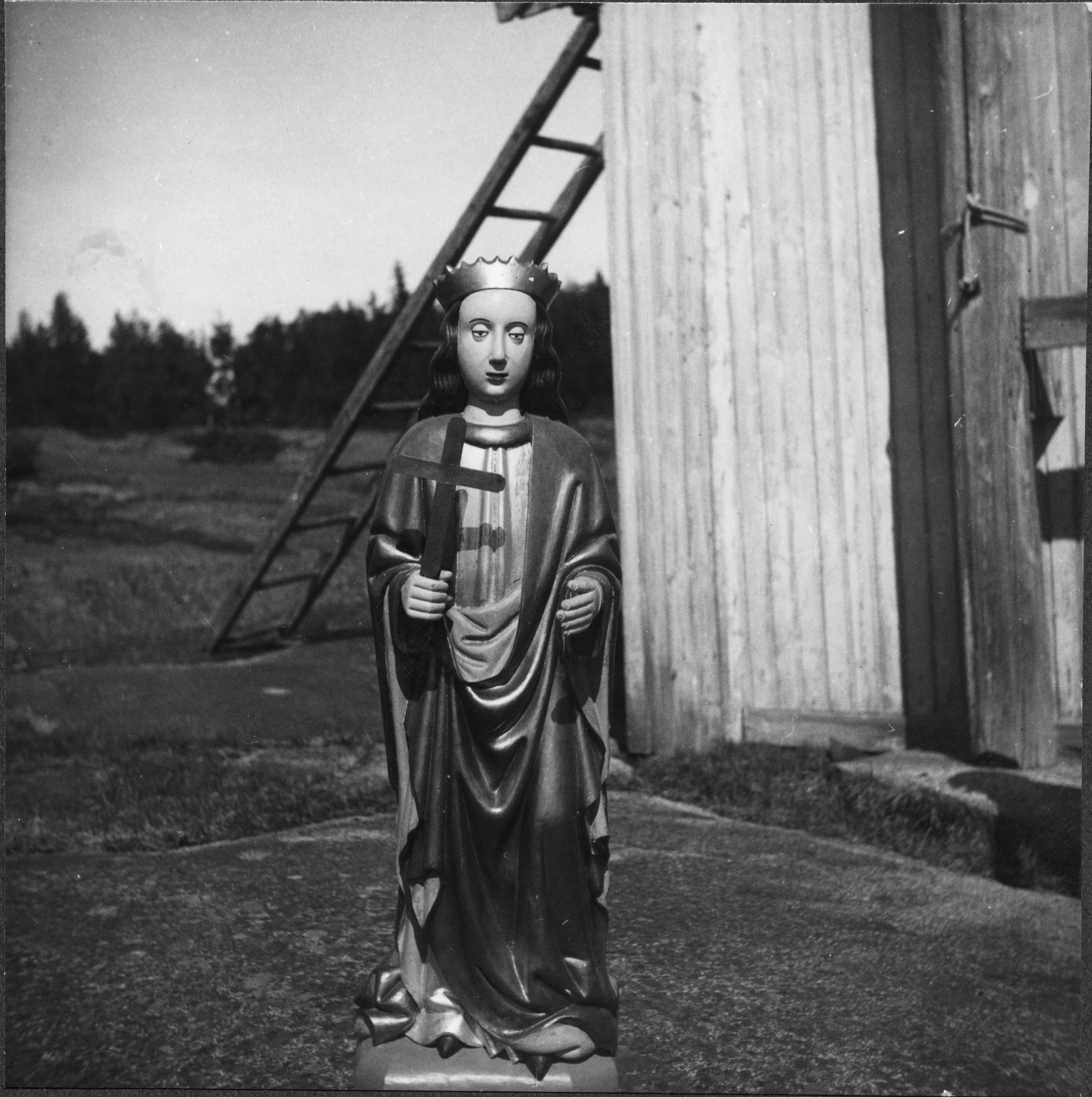 Beskrivning: Helgon, manligt. Träskulptur. Ny färg och förgyllning från 1908. Omkring 1500, snabbinv.