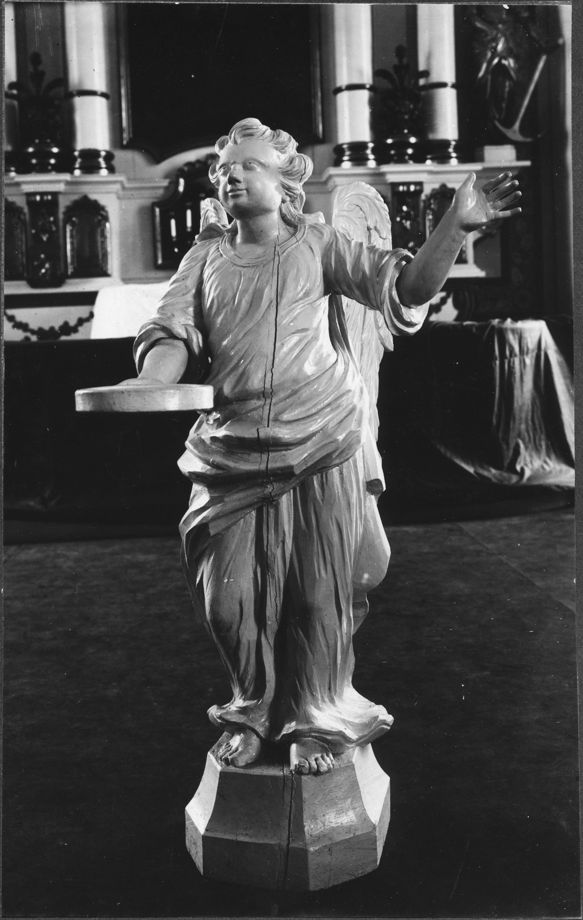 Beskrivning: Dopängel. Träskulptur, vit oljefärg, 1700-tal.