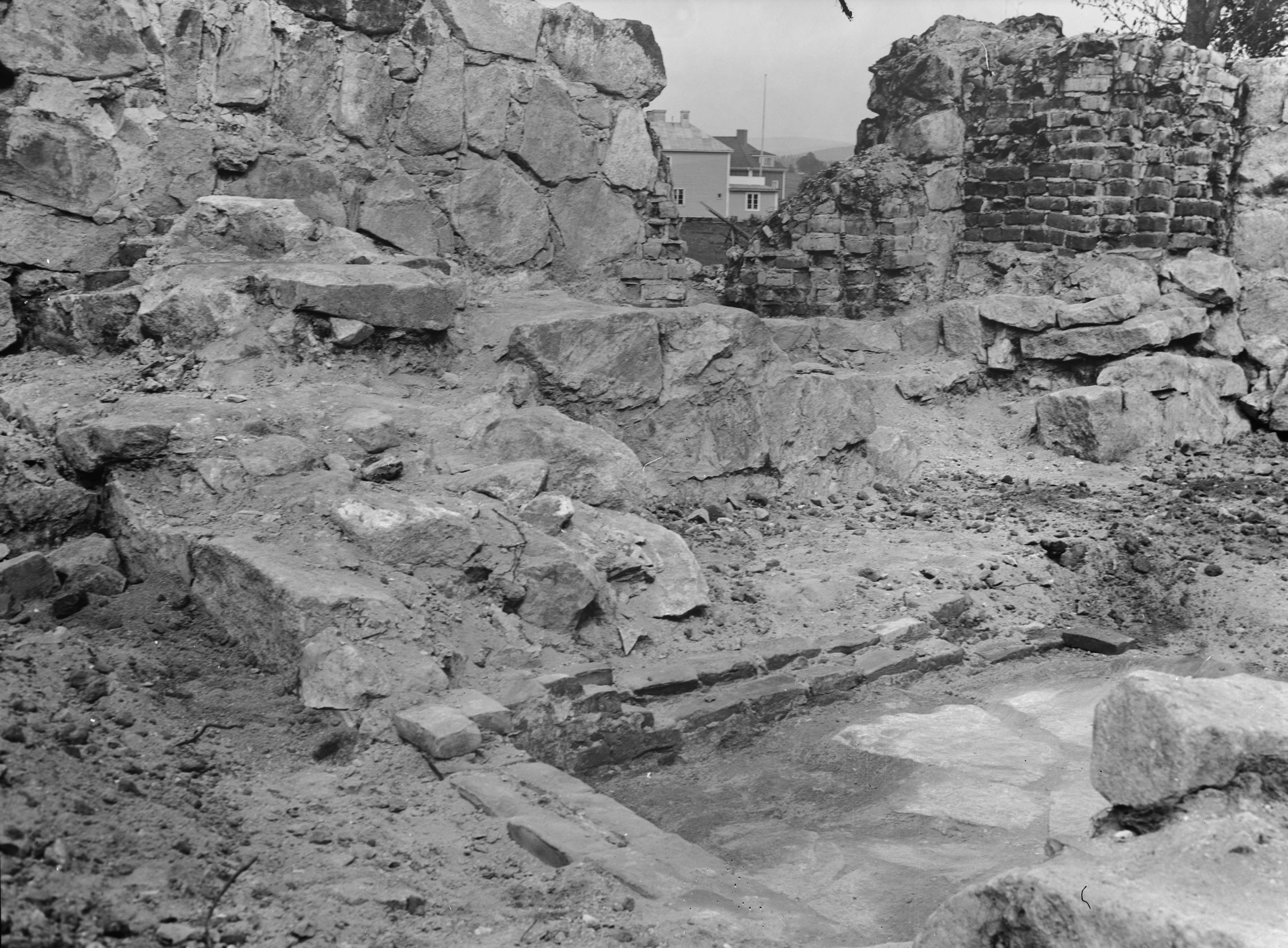 Beskrivning: Kyrkoruinen, norra delen av triumfbågsmuren, äldre norra korväggen. Under restaureringen.