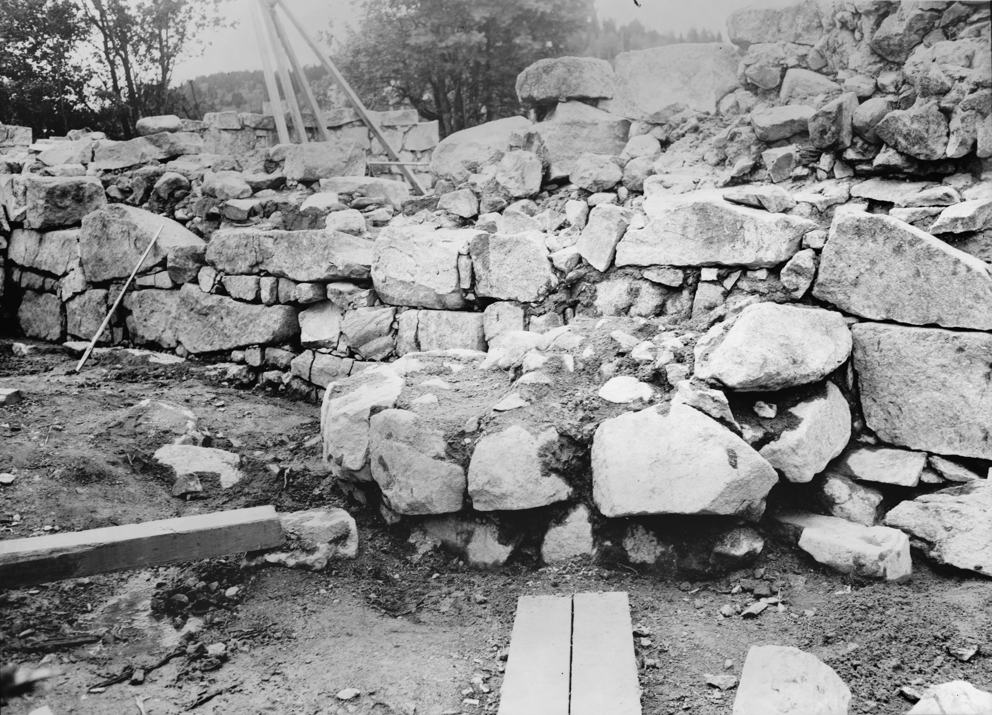 Beskrivning: Kyrkoruinen, södra väggens yttre försträvning. Från sydöst.