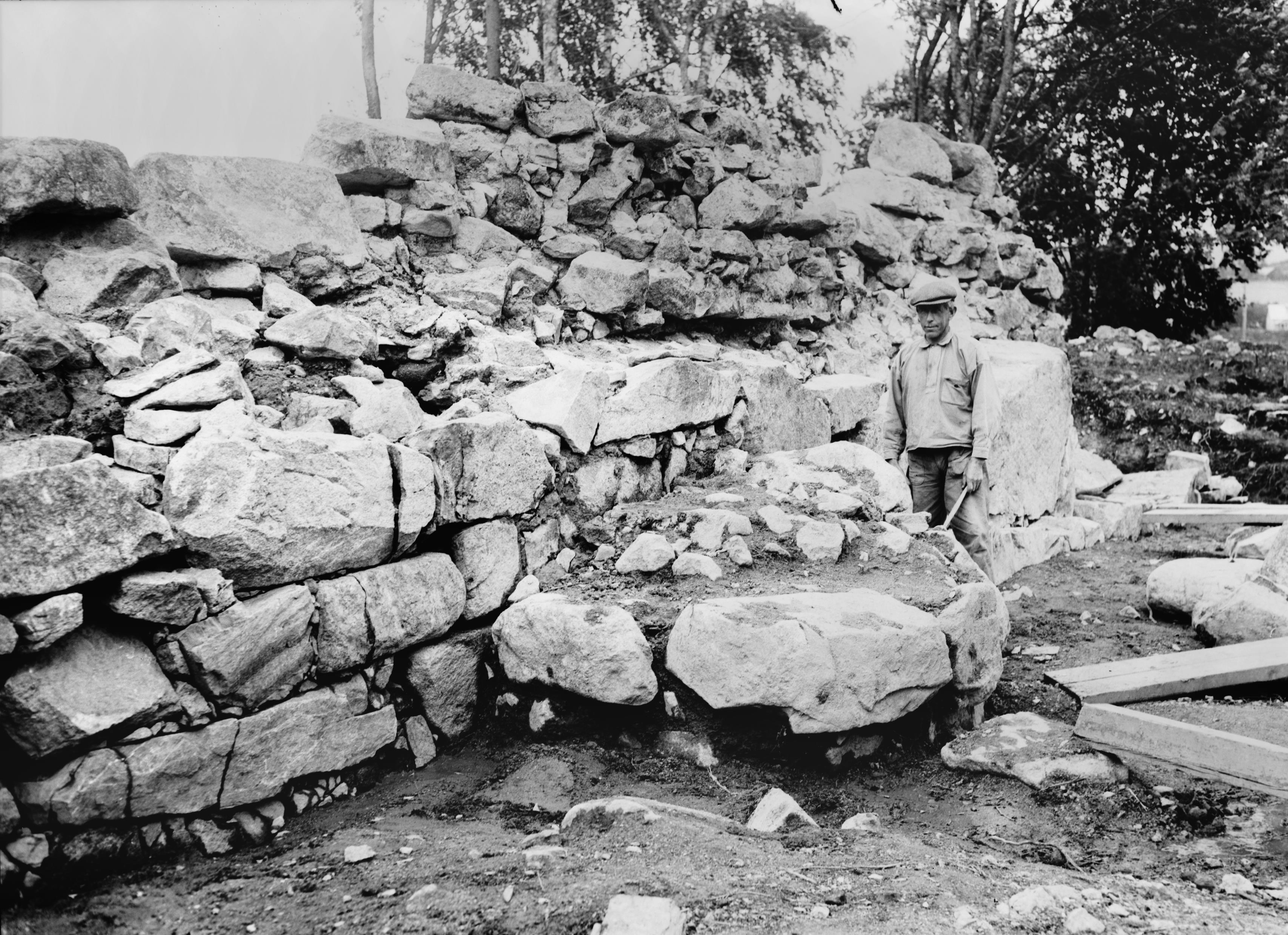 Beskrivning: Kyrkoruinen, södra väggens yttre försträvning.
