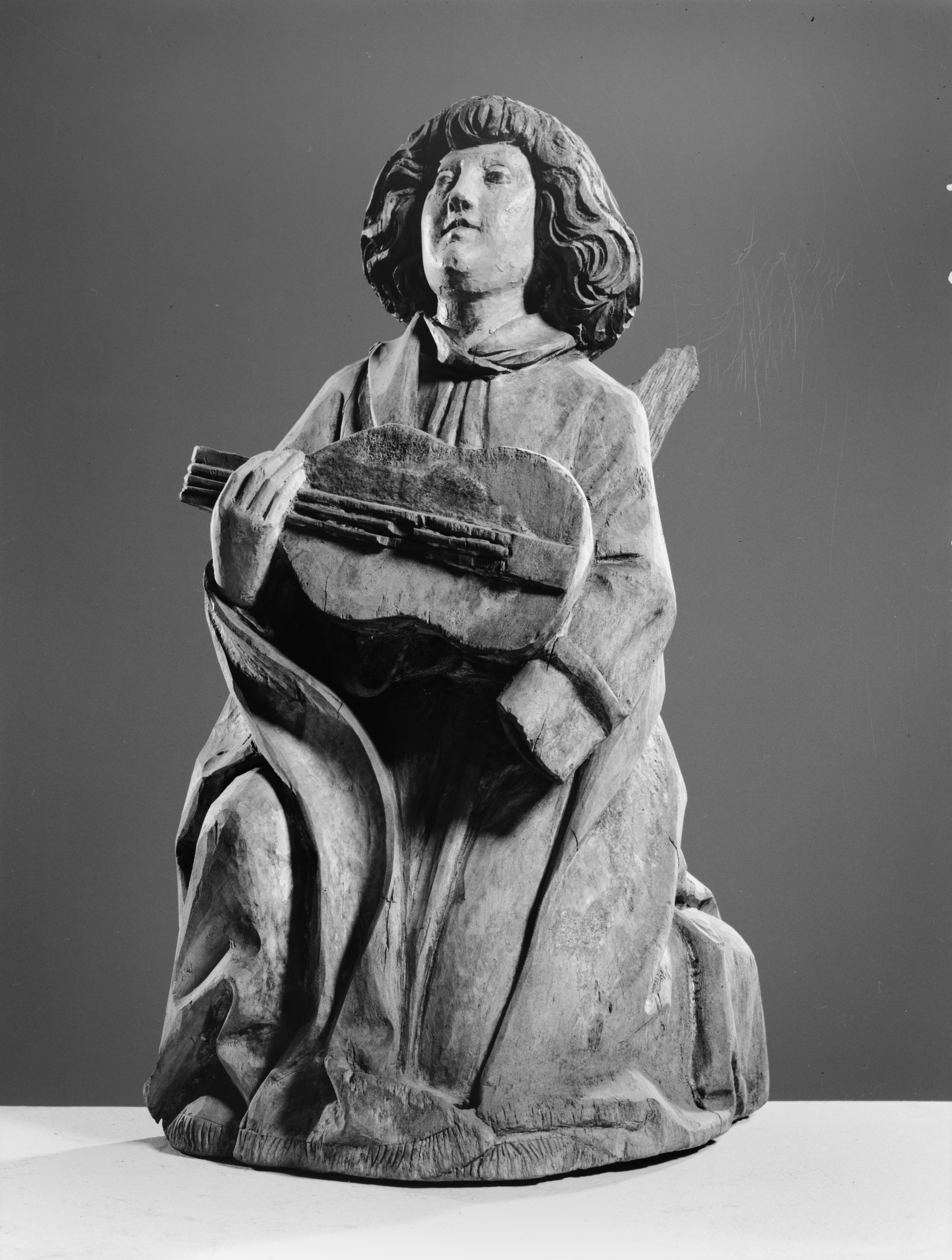 Beskrivning: Mariaskåpet, detalj av mindre lutspelande figur. Senmedeltida.