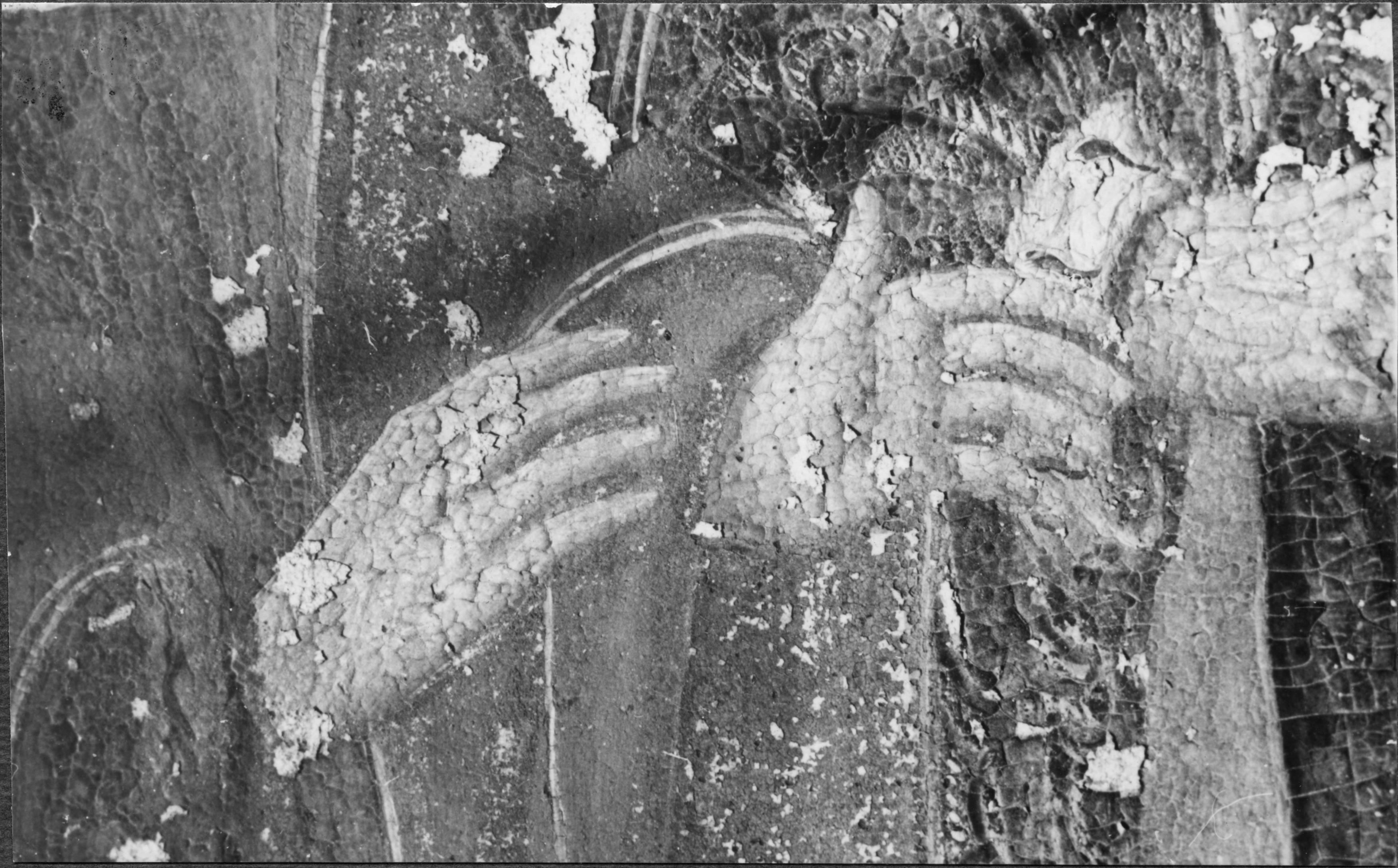 Beskrivning: Helgonskåp, Anna själv tredje. Senmedeltida. Detalj av högra flygeldörrens insida. Marias tempelgång, Annas händer.
